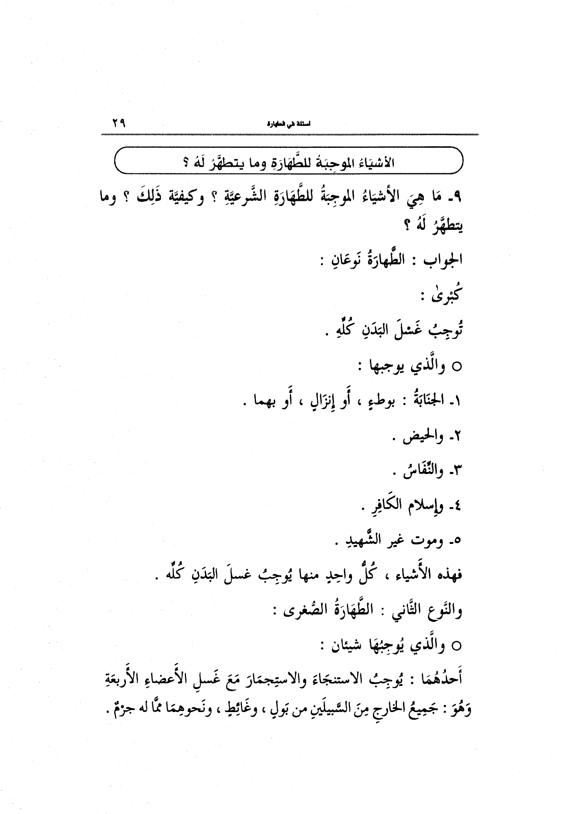 9- مَا هي الأشياء الموجِبَة للطَّهَارَةِ الشرعية؟ وكيفية ذَلِكَ؟ وما يتطهَّر له؟