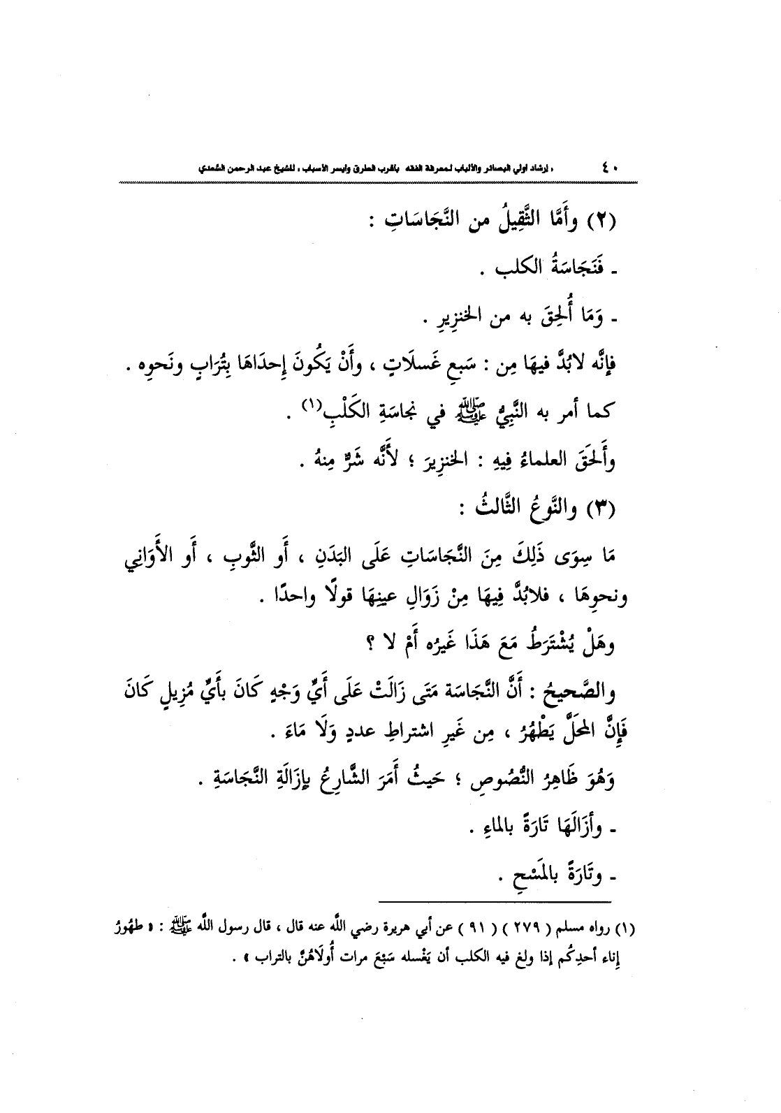 (3) وَالنَّوْع الثَّالِث: مَا سُوَى ذَلِكَ مِنَ النَّجَاسَاتِ عَلَى البَدَنِ، أو الثَّوْب، أو الأَوَانِي وَنَحْوهَا، فَلابدّ فِيهَا مِنْ زِوَال عينهَا قولاً واحدًا.