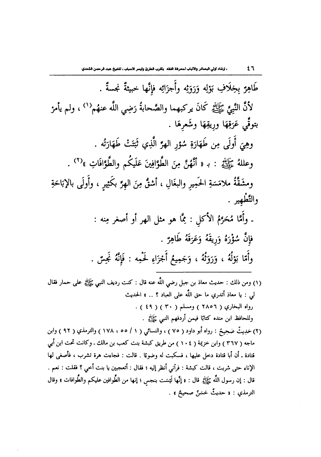 وَعَلَله - صلى الله عليه وسلم -: بـ «أنَّهُن من الطَّوَّافِينَ عَلَيكُم وَالطَّوَّافَات» .