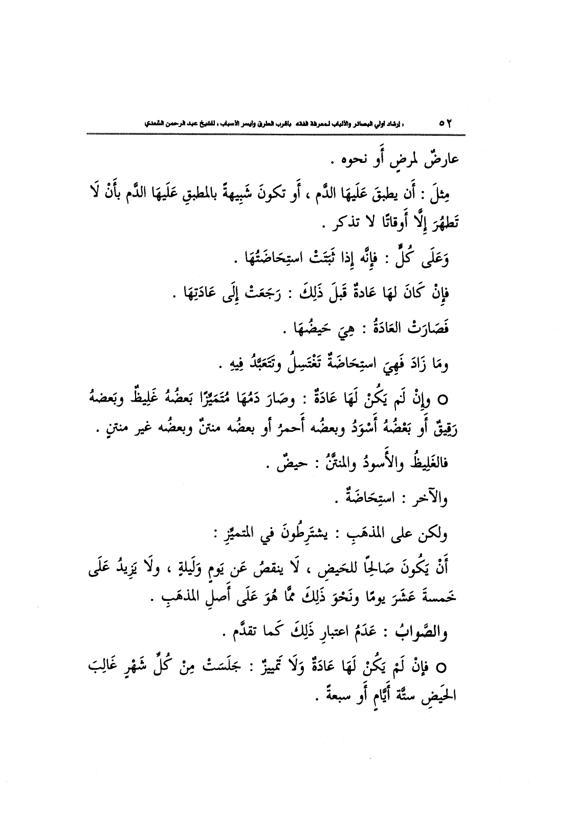 أَنْ يَكُونَ صَالِحًا للحيض، لا ينْقصُ عن يَوِمٍ وَلَيلةٍ، وَلا يزيد عَلَى خَمسةَ عَشَرَ يومًا وَنَحْو ذَلِكَ مما هَوّ عَلَى أَصلِ الْمَذْهَب.