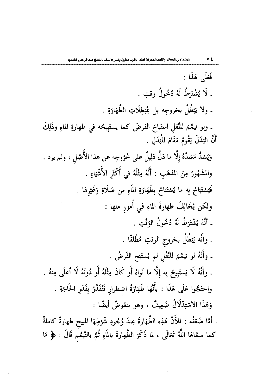 أمَّا ضَعْفُهُ: فلأَن هَذِه الطَّهَارةَ عِندَ وُجُود شَرْطهَا المبيحِ طهارة كاملةٌ كما سمَّاهَا اللَّه تَعَالَى، لما ذَكَرَ الطَّهَارَة بِالْمَاءِ ثم بالتَّيمُّمِ قَالَ: ? مَا