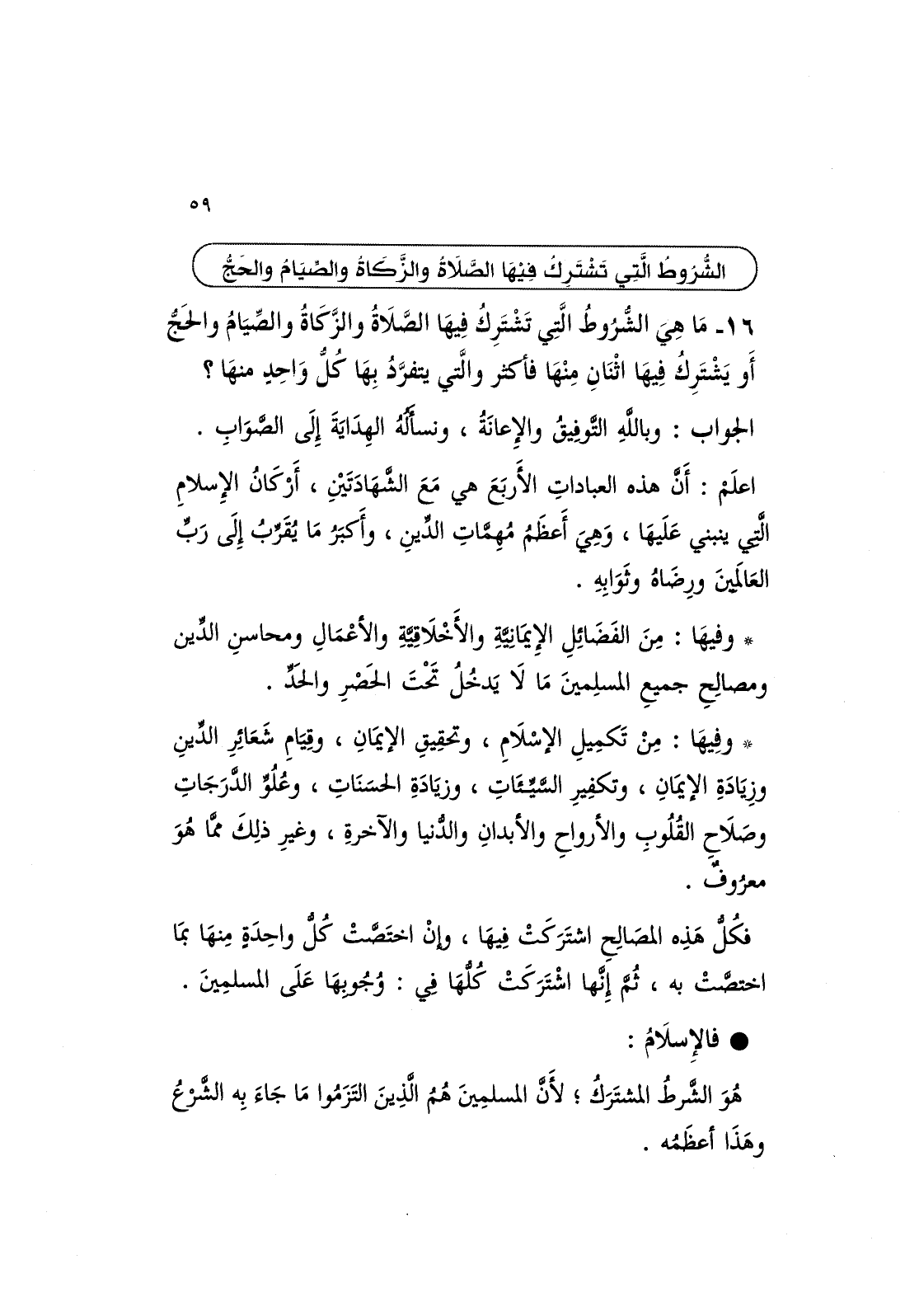 16- مَا هي الشروط الَّتِي تَشْتَرِكُ فِيهَا الصَّلاةُ والزَّكَاةُ والصِّيَامُ وَالْحج أَو يشترك فِيهَا اثْنَانِ مِنْهَا فأكثر والتي يتفرَّد بِهَا كُلُّ وَاحِدٍ منهَا؟