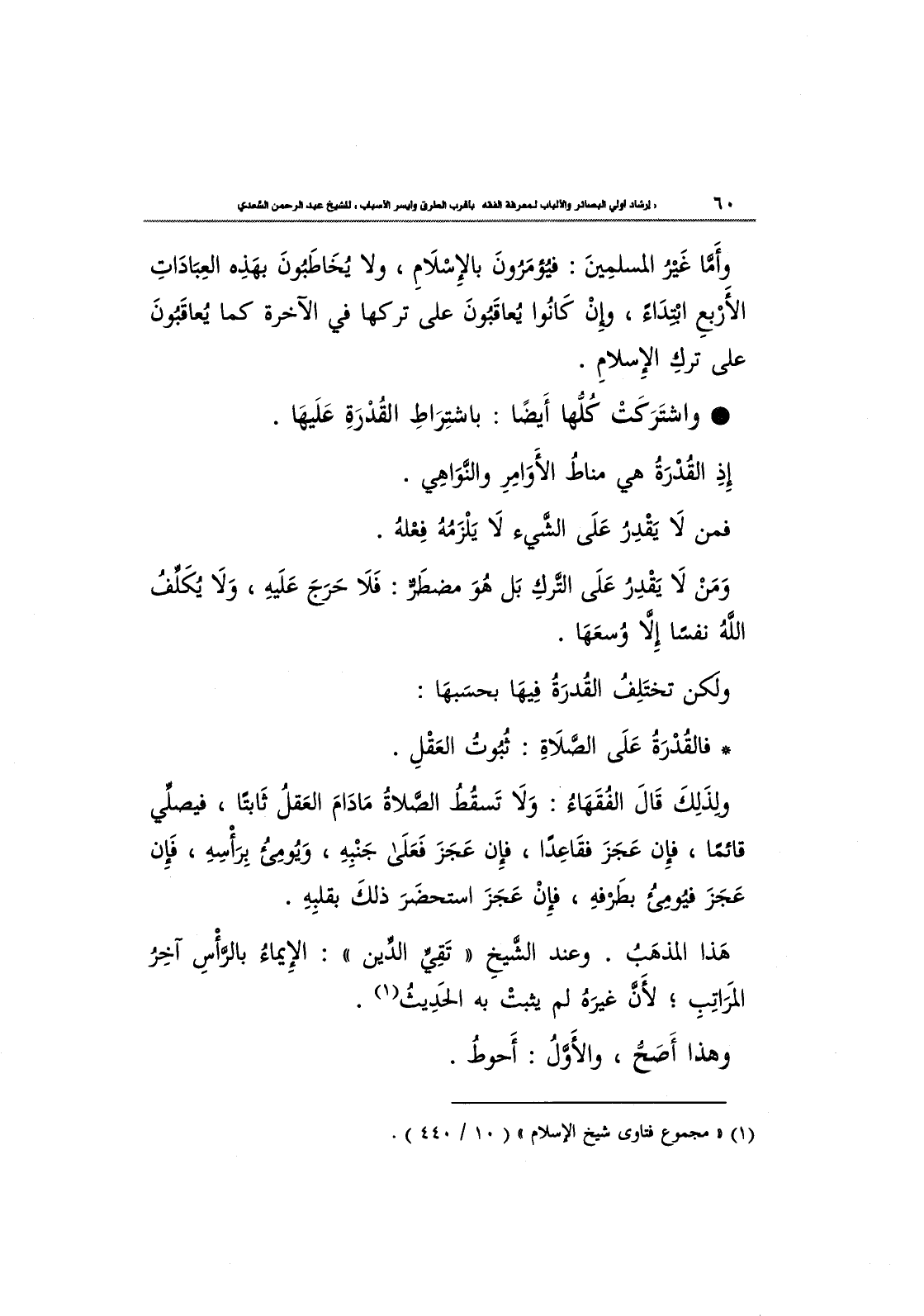 وَلِذَلِكَ قَالَ الفُقَهَاءُ: وَلا تَسقُطُ الصَّلاةُ مَادَامَ العَقلُ ثَابتًا، فيصلي قائمًا، فإِن عَجَزَ فقَاعِدًا، فإِن عَجَزَ فَعَلَى جَنْبه، وَيُومِئ برأسه، فَإِن عَجَزَ فيُومِئُ بطرفه، فإِنْ عَجَزَ استحضَرَ ذلكَ بِقَلْبِهِ.
