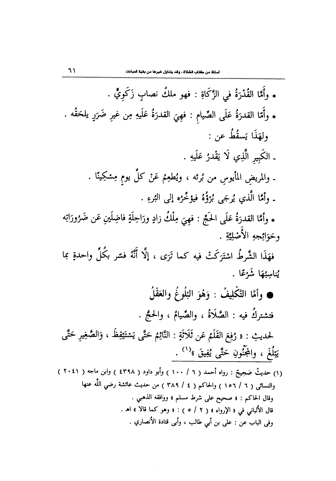 وأمَّا التَّكْلِيفُ: وَهُوَ الْبُلُوغ والعَقْل.