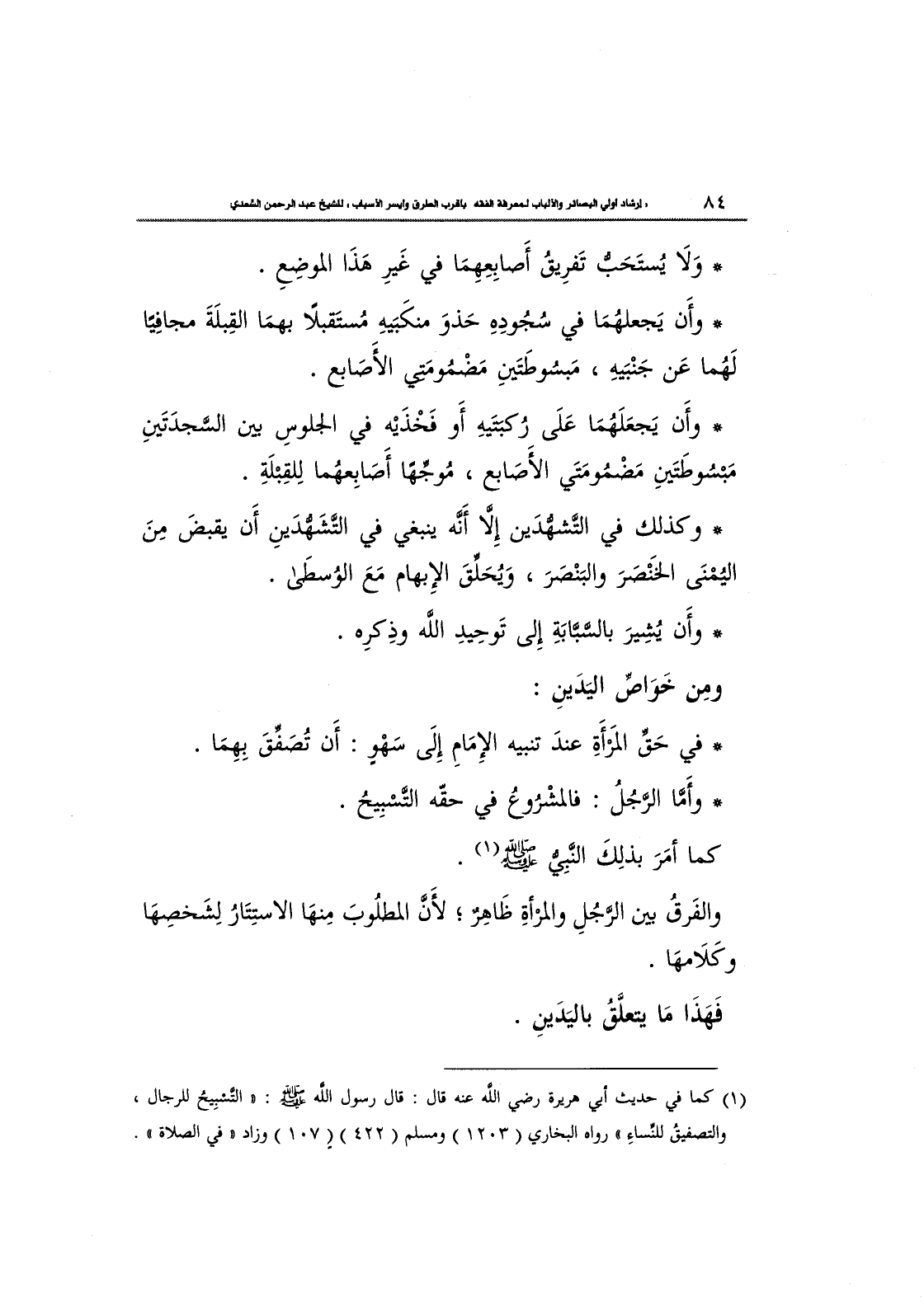 وَأَن يَجعلهُمَا في سُجُودِهِ حَذْوَ منكبِيهِ مُسْتَقْبلاً بِهمَا القِبلَةَ مجافِيًا لَهُما عَن جَنبيهِ، مَبْسُوطَتَيْنِ مَضْمُومَتَيْ الأَصَابع.