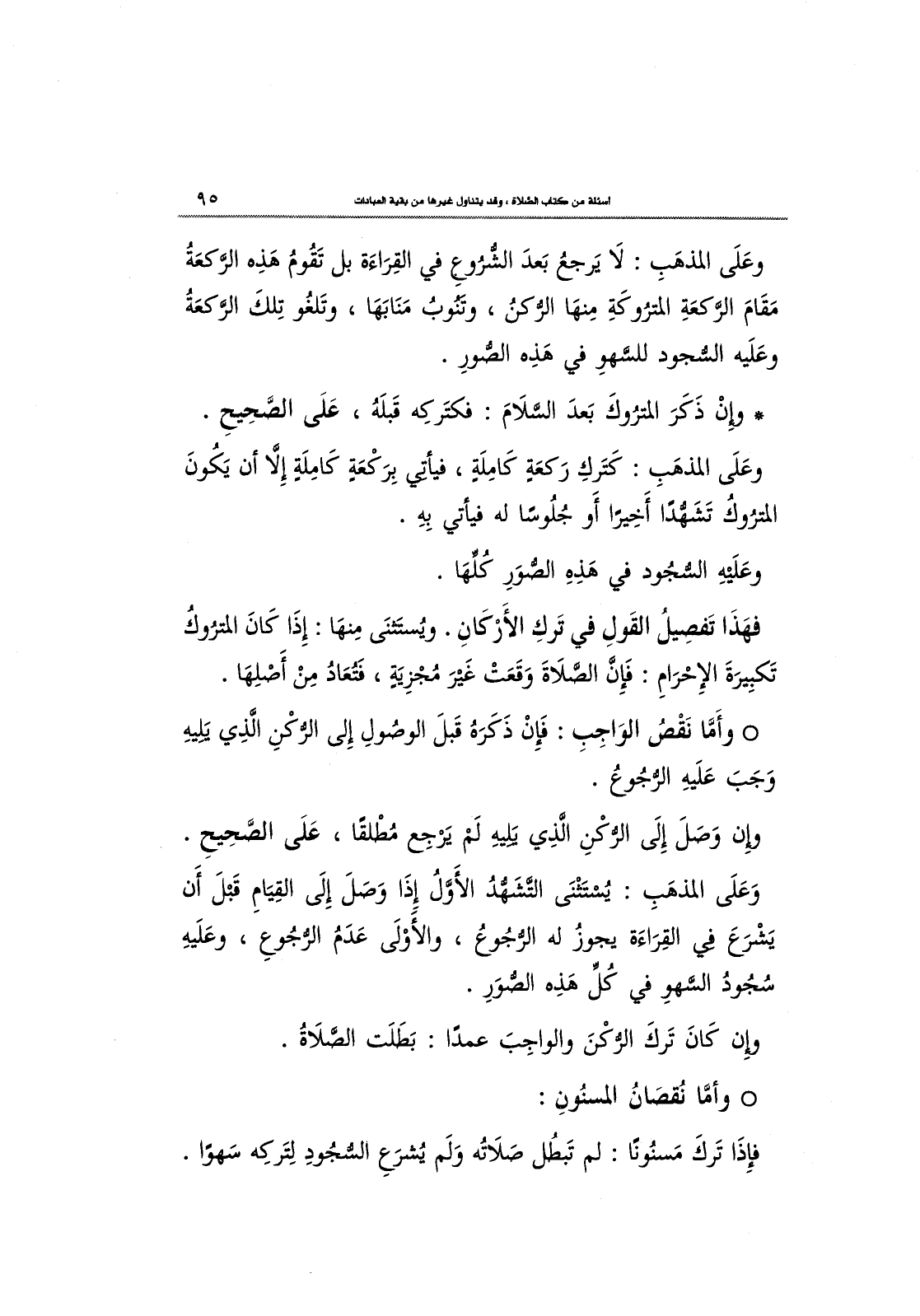 وَعَلَى المذهَبِ: يُسْتَثْنَى التَّشَهُّدُ اَلأَوَّلُ إِذَا وَصَلَ إِلَى القِيَامِ قَبْلَ أَن يَشْرَعَ في القِرَاءَة يجوزُ له الرُّجُوعُ، والأَوْلَى عَدَمُ الرُّجُوعِ، وعَلَيهِ سُجُودُ اَلسَّهْو في كُلِّ هَذِه الصُّوَرِ.