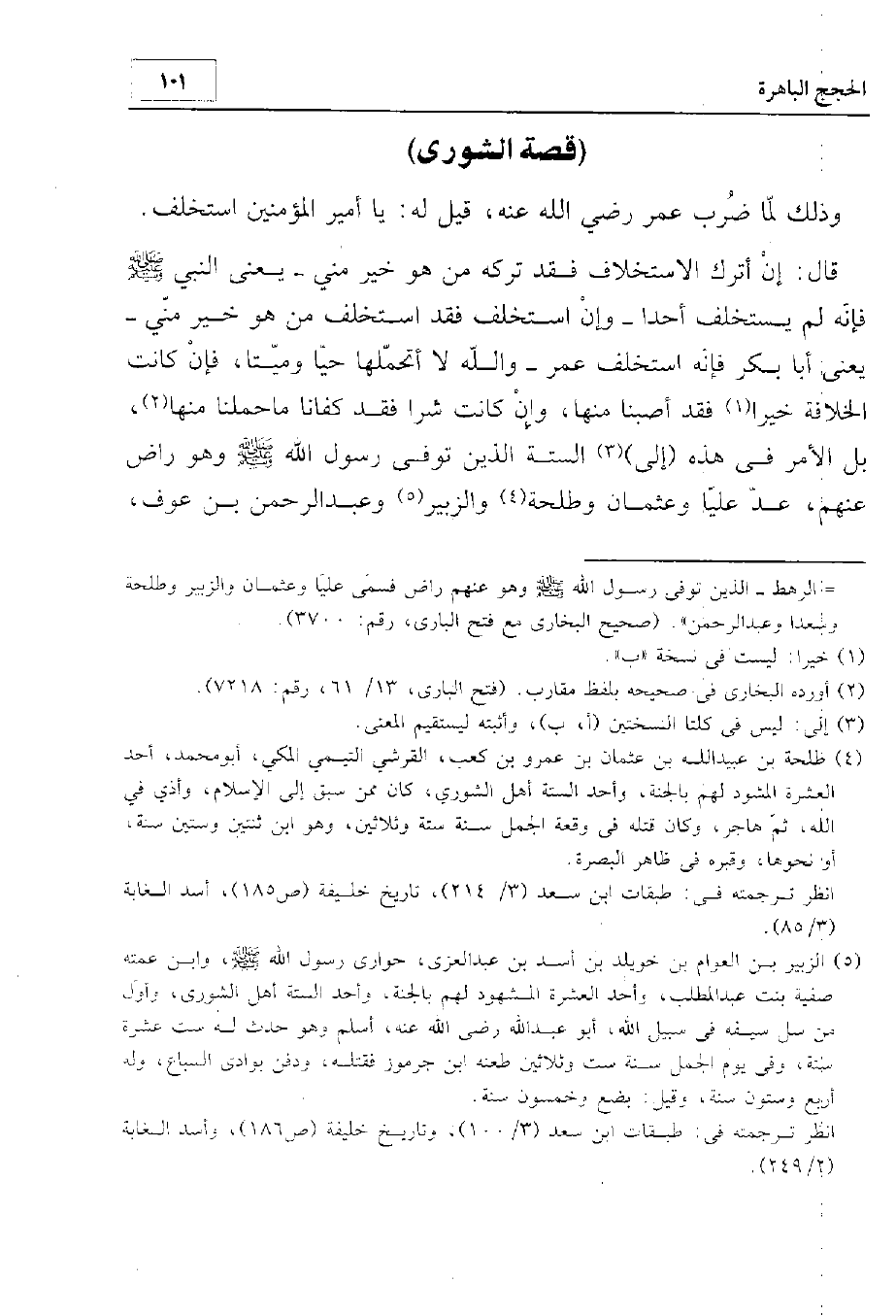 وذلك لما ضرب عمر رضي الله عنه قيل له: يا أمير المؤمنين استخلف. قال: إن أترك الاستخلاف فقد تركه من هو خير مني -يعني النبي - صلى الله عليه وسلم - فإنه لم يستخلف أحدا- وإن أستخلف فقد استخلف من هو خير مني -يعني أبا بكر، فإنه استخلف عمر- وإن كانت شرا فقد كفانا ما حملنا منها، بل الأمر في هذه الستة الذين توفي رسول الله - صلى الله عليه وسلم - وهو راض عنهم. عدّ عليا وعثمان وطلحة والزبير وعبد الرحمن بن عوف