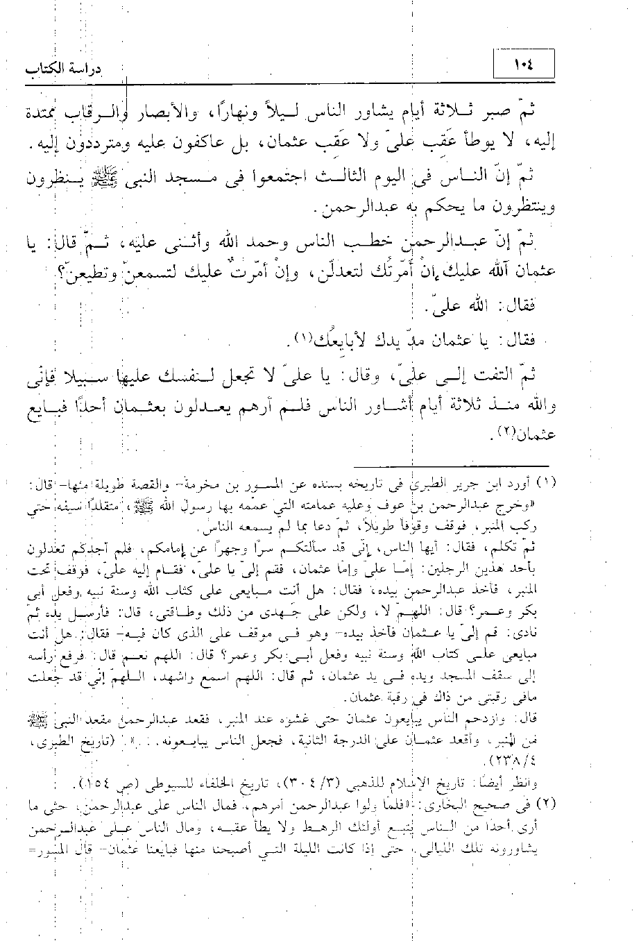 ثم صبر ثلاثة أيام يشاور الناس ليلا ونهارا، والأبصار والرقاب ممتدة إليه، لا يوطأ عقب علي ولا يوطأ عقب عثمان، بل عاكفون عليه ومترددون إليه. ثم إن الناس في اليوم الثالث اجتمعوا في مسجد النبي - صلى الله عليه وسلم - ينظرون وينتظرون ما يحكم به عبد الرحمن. ثم إن عبد الرحمن خطب الناس وحمد الله وأثنى عليه ثم قال: يا عثمان، آلله عليك إن أمّرتك لتعدلن وإن أمرت عليك لتسمعن وتطيعن؟ فقال: الله علي. فقال: يا عثمان مد يدك لأبايعك. ثم التفت إلى علي وقال: يا علي لا تجعل لنفسك عليها سبيلا، فإني والله منذ ثلاثة أيام أشاور الناس فلم أرهم يعدلون بعثمان أحدا. فبايع عثمانَ