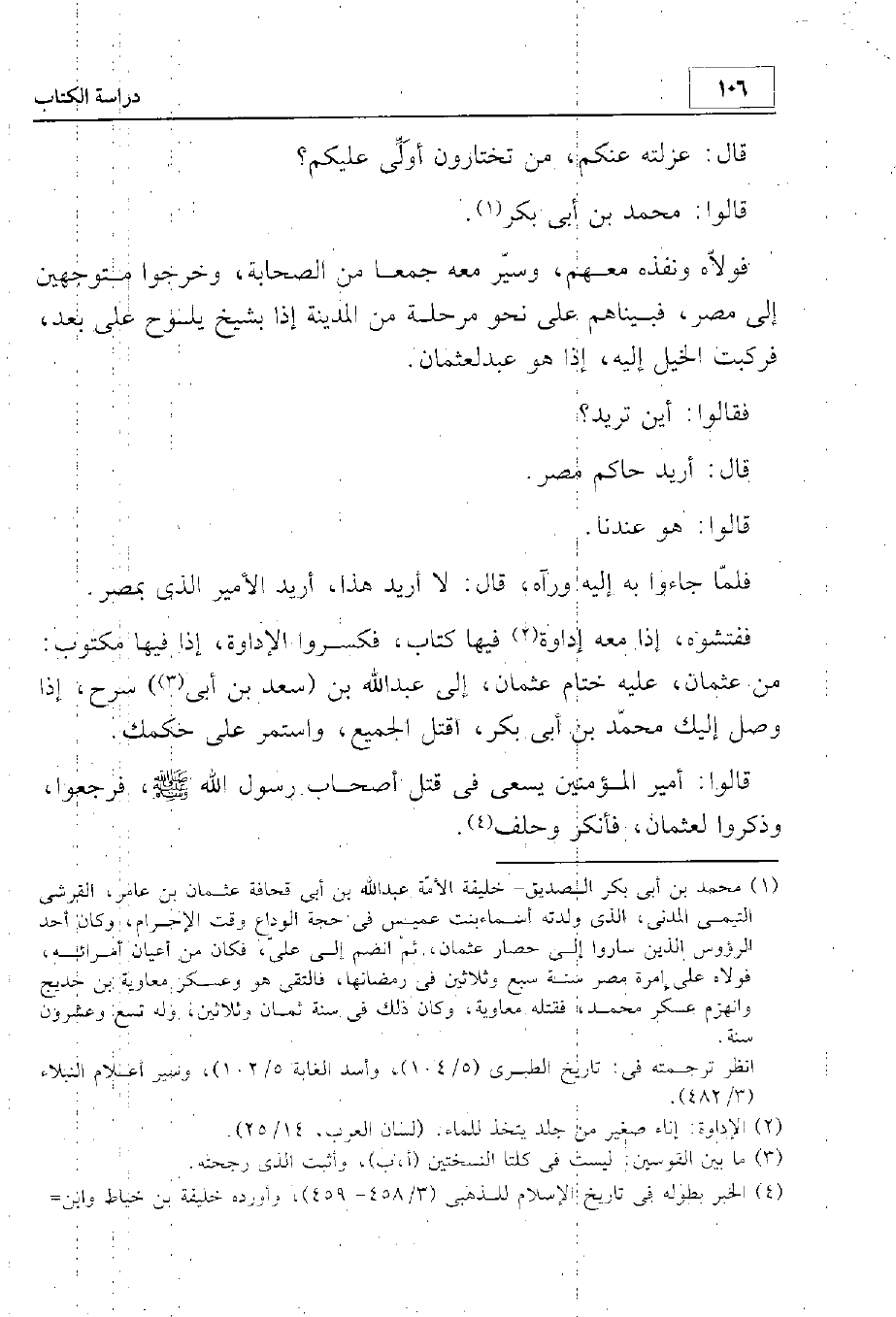 قال: عزلته عنكم، من تختارون أولي عليكم؟ قالوا: محمد بن أبي بكر. فولاه ونفذه معهم. وسيّر معه جمعا من الصحابة. وخرجوا متوجهين إلى مصر. فبينا هم على نحو مرحلة من المدينة إذا بشبح يلوح على بعد، فركبت الخيل إليه، إذا هو عبد لعثمان. فقالوا: أين تريد؟ قال: أريد حاكم مصر، قالوا: هو عندنا. فلما جاءوا به إليه ورآه قال: لا أريد هذا، أريد الأمير الذي بمصر. ففتشوه إذا معه إداوة فيها كتاب. فكسروا الإداوة، إذا فيها مكتوب: من عثمان، عليه ختم عثمان، إلى عبد الله بن [أبي] سرح، إذا وصل إليك محمد بن أبي بكر ومن معه اقتل الجميع واستمر على حكمك. قالوا: أمير المؤمنين يسعى في قتل أصحاب رسول الله - صلى الله عليه وسلم -. فرجعوا وذكروا لعثمان، فأنكر وحلف.