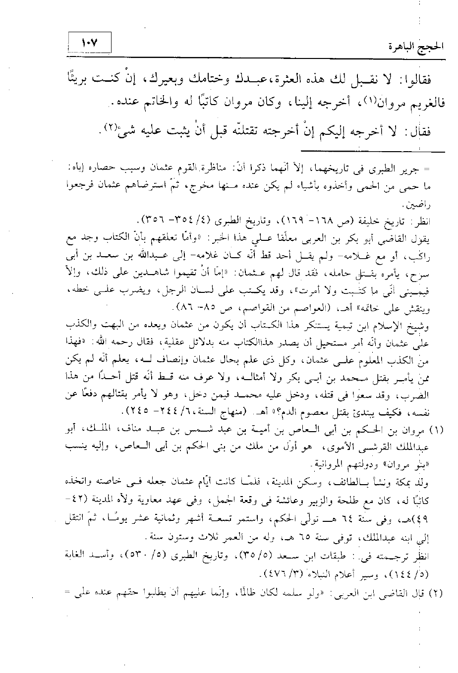 فقالوا: لا نقبل لك هذه العثرة، عبدك وبعيرك وخاتمك، إن كنت بريئا فالغريم مروان، أخرجه إلينا. وكان مروان كاتبا له والخاتم عنده. فقال: لا أخرجه إليكم، إن أخرجته تقتلنه قبل أن يثبت عليه شيء.