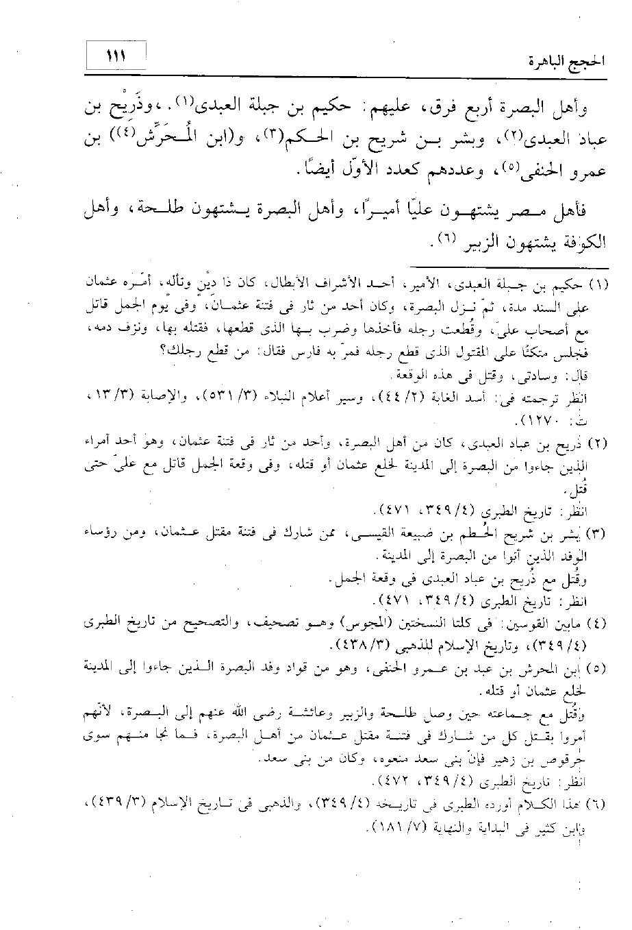 وأهل البصرة أربع فرق، عليهم حكيم بن جبلة العبدي وذريح بن عباد العبدي وبشر بن شريح بن الحكم و [ابن محرش] بن عمرو الحنفي. وعددهم كعدد الأول. فأهل مصر يشتهون عليا أميرا. وأهل البصرة يشتهون طلحة. وأهل الكوفة يشتهون الزبير.