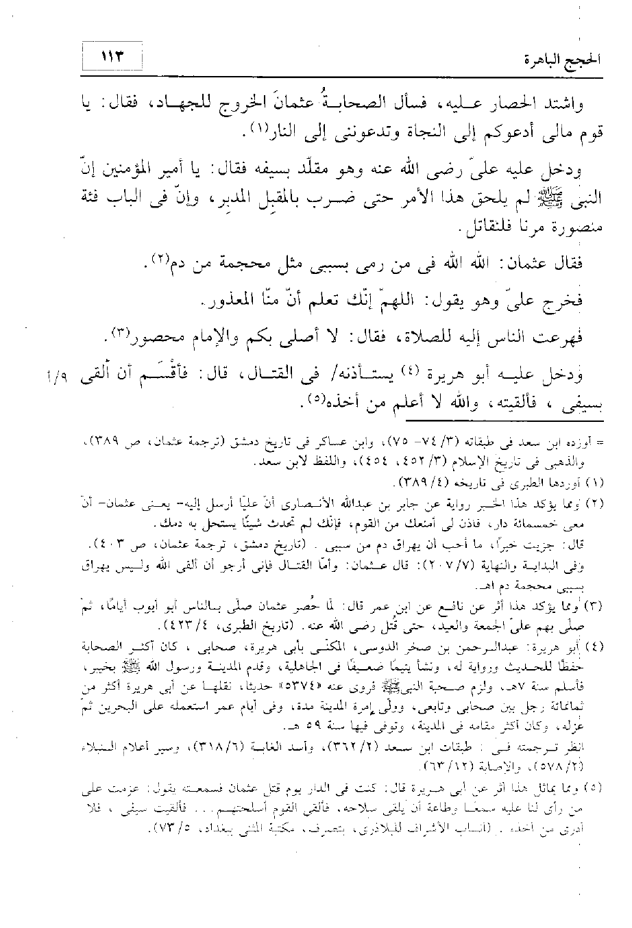 واشتد الحصار عليه. فسأل الصحابة عثمان الخروج للجهاد فقال: يا قوم ما لي أدعوكم إلى النجاة وتدعونني إلى النار. ودخل عليه علي رضي الله عنه وهو مقلد بسيفه فقال: يا أمير المؤمنين، إن النبي - صلى الله عليه وسلم - لم يلحق هذا الأمر حتى ضرب بالمقبل المدبر، وإن في الباب فئة منصورة، مرنا فلنقاتل. فقال عثمان: الله الله في من رمى بسببي مثل محجمة من دم. فخرج علي وهو يقول: اللهم إنك تعلم أن منا المعذور. فهرعت الناس إليه للصلاة فقال: لا أصلي بكم والإمام محصور. ودخل عليه أبو هريرة يستأذنه في القتال، قال: فأقسم أن ألقي سيفي، فألقيته، والله لا أعلم من أخذه.