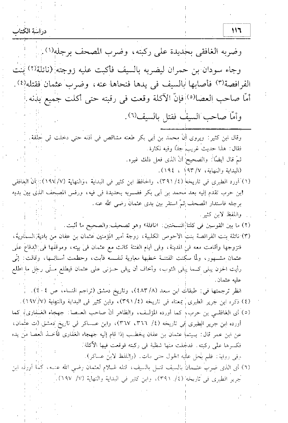 وضربه الغافقي بحديدة على ركبته، وضرب المصحف برجله. وجاء سودان بن حمران ليضربه بالسيف، فأكبت عليه زوجته نائلة بنت الفرافصة فأصابها بالسيف في يدها، فنحاها عنه، وضرب عثمان فقتله. أما صاحب العصا فإن الأكلة وقعت في رقبته حتى أكلت جميع بدنه. وأما صاحب السيف فقتل بالسيف.