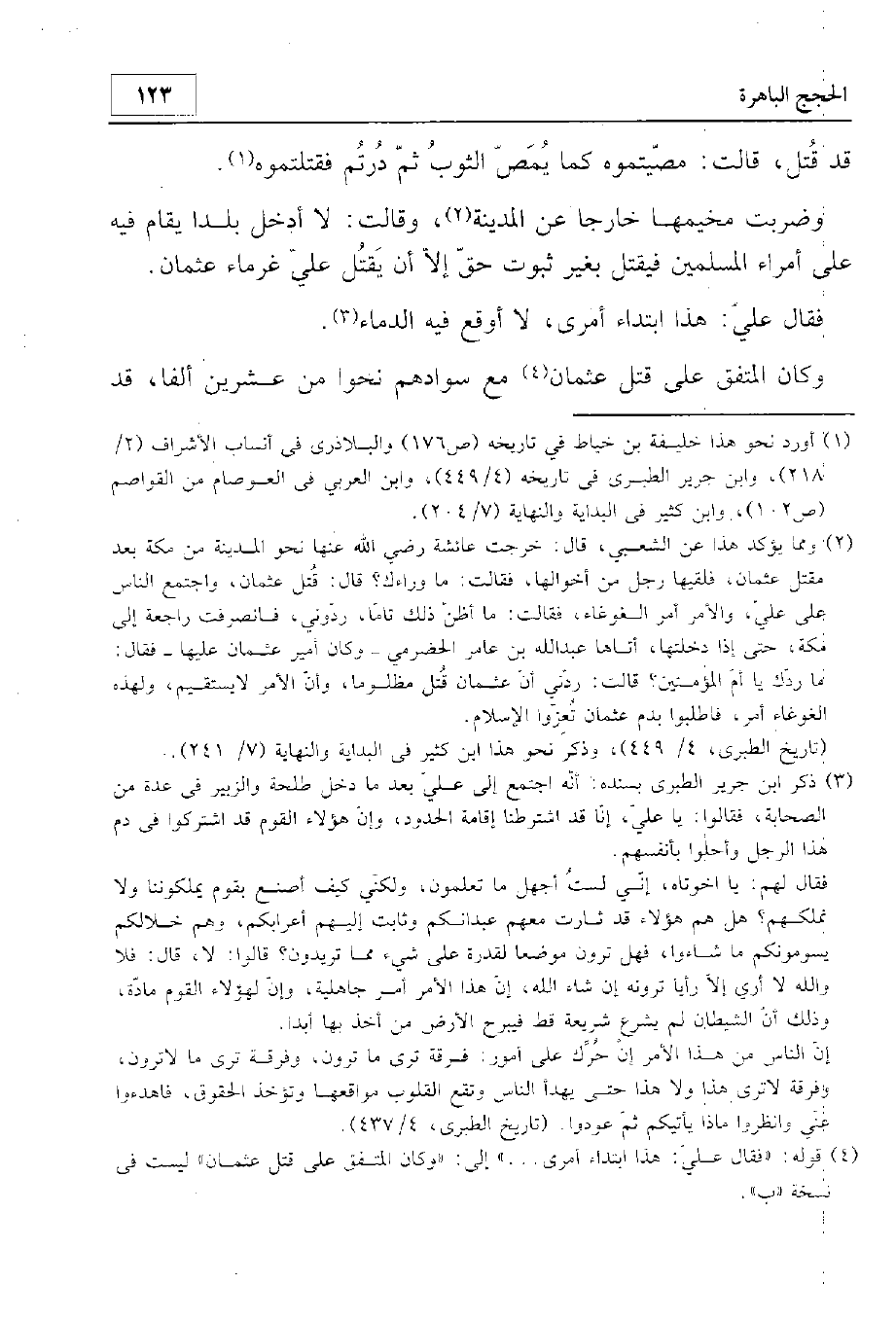 قد قتل، قالت: مصيتموه كما يمص الثوب ثم درتم فقتلتموه. وضربت مخيمها خارجا عن المدينة وقالت: لا أدخل بلدا يقام فيه على أمير المسلمين فيقتل بغير ثبوت حق إلا أن يقتل علي غرماء عثمان. فقال علي: هذا ابتداء أمري، لا أوقع فيه الدماء. وكان المتفق على قتل عثمان مع سوادهم نحوا من عشرين ألفا قد