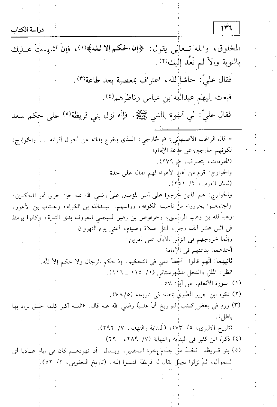 المخلوق والله تعالى يقول: {إِنِ الْحُكْمُ إِلَّا لِلَّهِ} فإن أشهدت عليك بالتوبة وإلا لم نعد إليك. فقال علي: حاشا لله اعتراف بمعصية بعد طاعة. فبعث إليهم عبد الله بن عباس وناظرهم. فقال علي: لي أسوة بالنبي - صلى الله عليه وسلم - فإنه نزل بني قريظة على حكم سعد