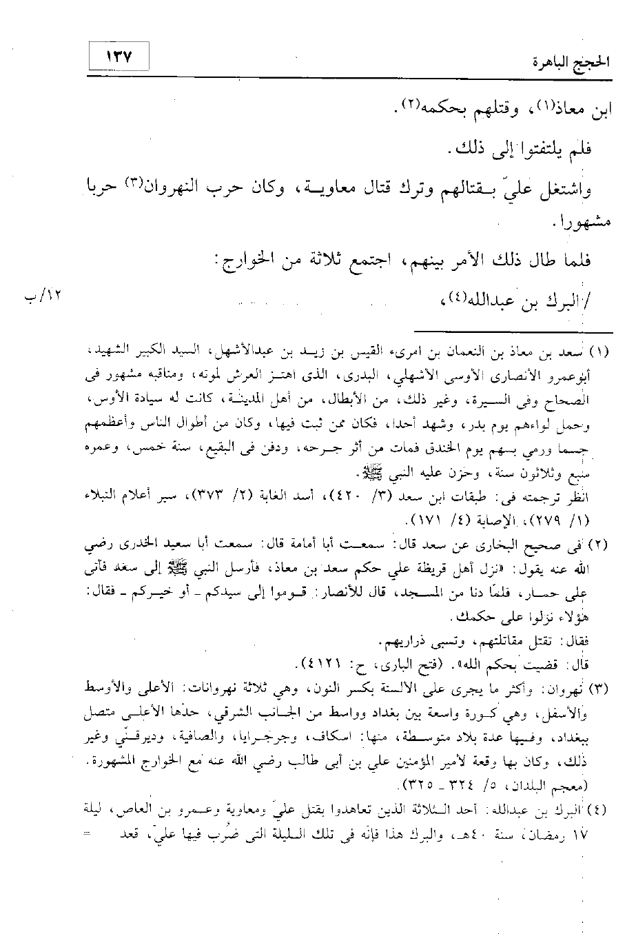 بن معاذ وقتلهم بحكمه. فلم يلتفتوا إلى ذلك. واشتغل علي بقتالهم. وترك قتال معاوية. وكان حرب النهروان حربا مشهورا. فلما طال ذلك الأمر بينهم اجتمع ثلاثة من الخوارج: البرك بن عبد الله