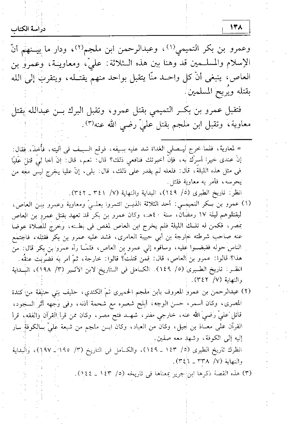 وعمرو بن بكر التميمي وعبد الرحمن بن ملجم، ودار بينهم أن الإسلام والمسلمين قد وهنا بين هذه الثلاثة علي ومعاوية وعمرو بن العاص، ينبغي أن كلا منا يتقبل بواحد منه يقتله ويتقرب إلى الله ويريح المسلمين. فتقبل عمرو بن بكر التميمي بقتل عمرو، وتقبل البرك بن عبد الله بقتل معاوية، وتقبل ابن ملجم بقتل علي رضي الله عنه.