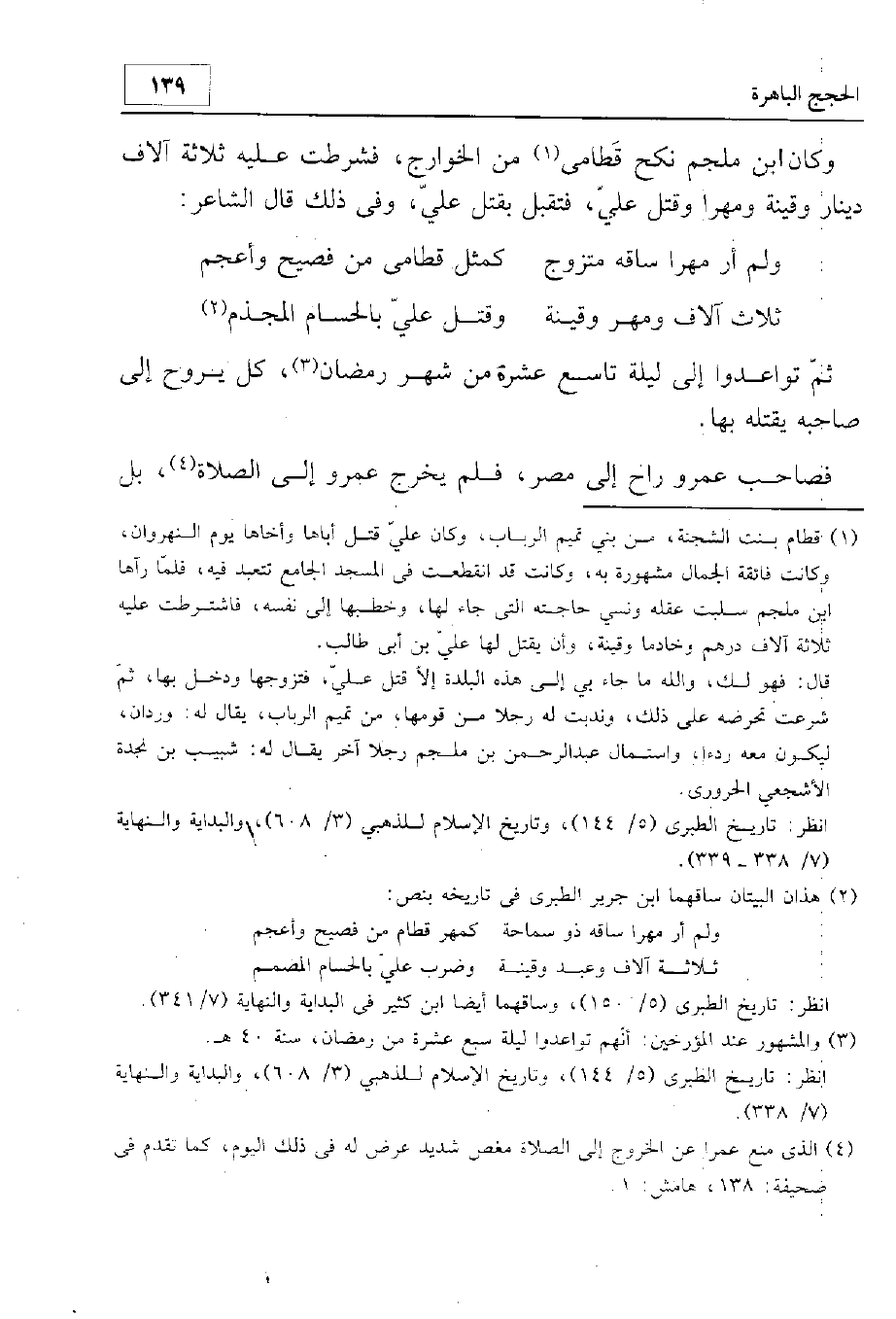 وكان ابن ملجم نكح قطام من الخوارج، فشرطت عليه ثلاثة آلاف دينار وقينة ومهرا وقتل علي، فتقبل بقتل علي. وفي ذلك قال الشاعر: