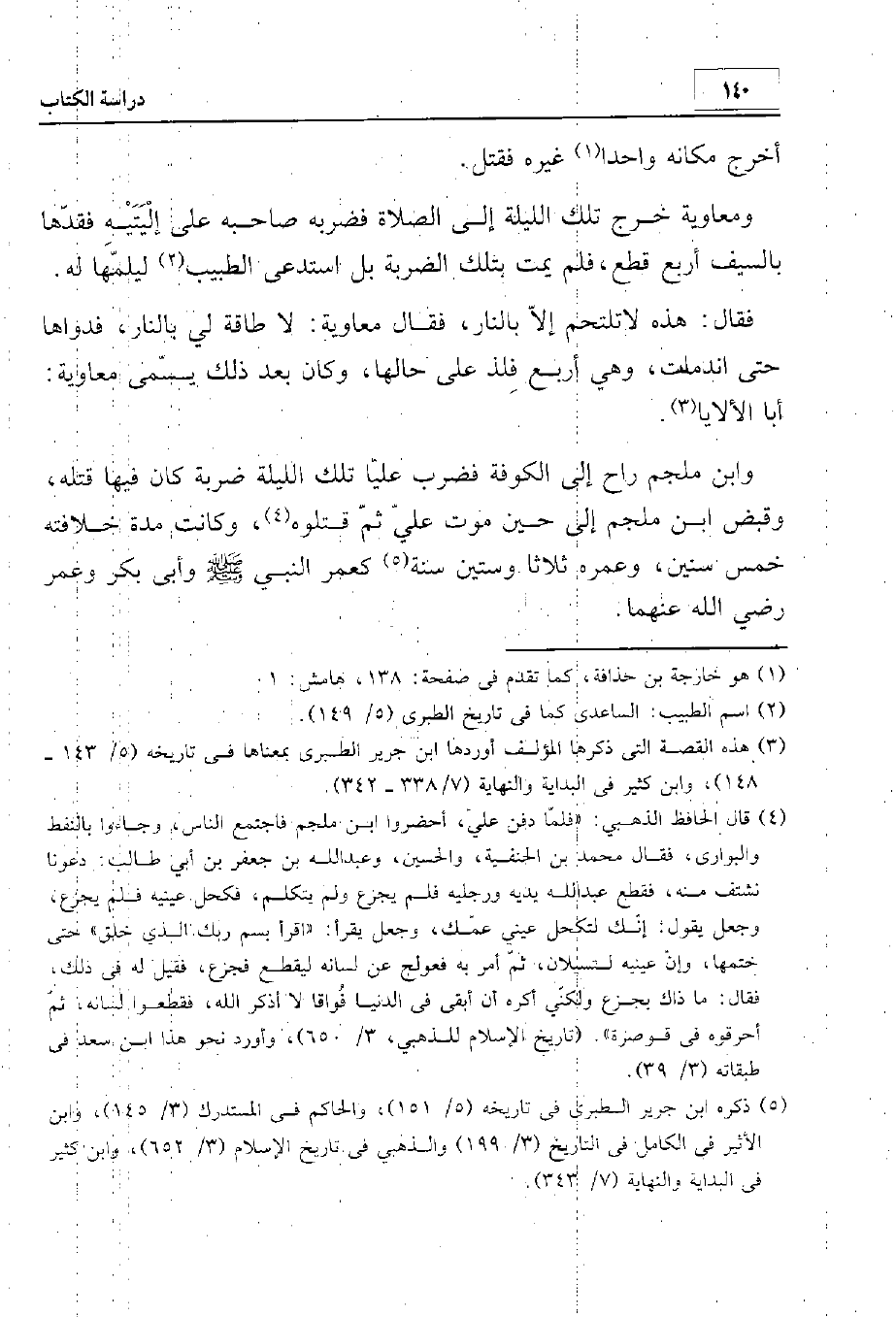 أخرج مكانه واحدا غيره فقتل. ومعاوية خرج تلك الليلة إلى الصلاة فضربه صاحبه على إليتيه فقدّها بالسيف أربع قطع، فلم يمت بتلك الضربة بل استدعى الطبيب ليلمها له، فقال: هذه لا تلحم إلا بالنار، فقال معاوية: لا طاقة لي بالنار. فداواها حتى اندملت، وهي أربع فلذ على حالها. وكان بعد ذلك يسمى معاوية أبا الألايا. وابن ملجم راح إلى الكوفة فضرب عليا تلك الليلة ضربة كان فيها قتله. وقبض ابن ملجم إلى حين موت علي ثم قتلوه. وكانت مدة خلافته خمس سنين، وعمره ثلاثا وستين سنة، كعمر النبي - صلى الله عليه وسلم - وأبي بكر وعمر رضي الله عنهما.