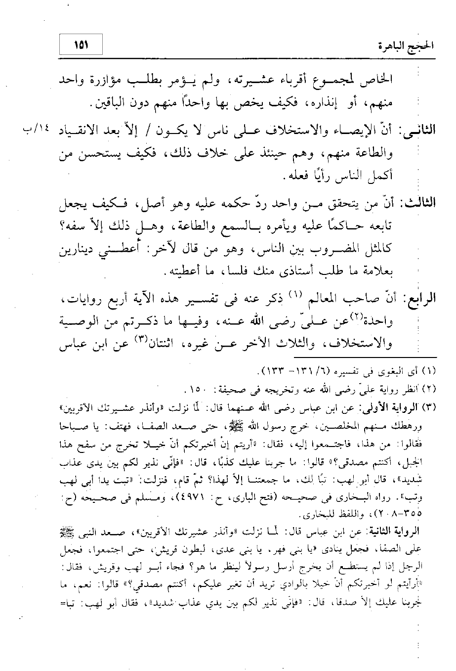 الثالث: أن من يتحقق من واحد رد حكمه عليه وهو أصل، فكيف يجعل تابعه حاكما عليه ويأمره بالسمع والطاعة، وهل ذلك إلا سفه، كالمثل المضروب بين الناس، وهو: من قال لآخر أعطني دينارين بعلامة ما طلب أستاذي منك فلسا ما أعطيته.