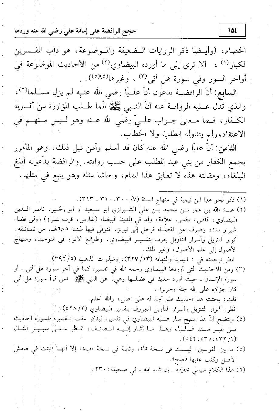 السابع أن الرافضة يدعون أن عليا رضي الله عنه لم يزل مسلما. والذي تدل عليه الرواية عنه أن النبي رضي الله عنه إنما طلب المؤازرة من أقاربه الكفار. فما معنى جواب علي رضي الله عنه وهو ليس منهم في الاعتقاد ولم يتناوله الطلب ولا الخطاب.