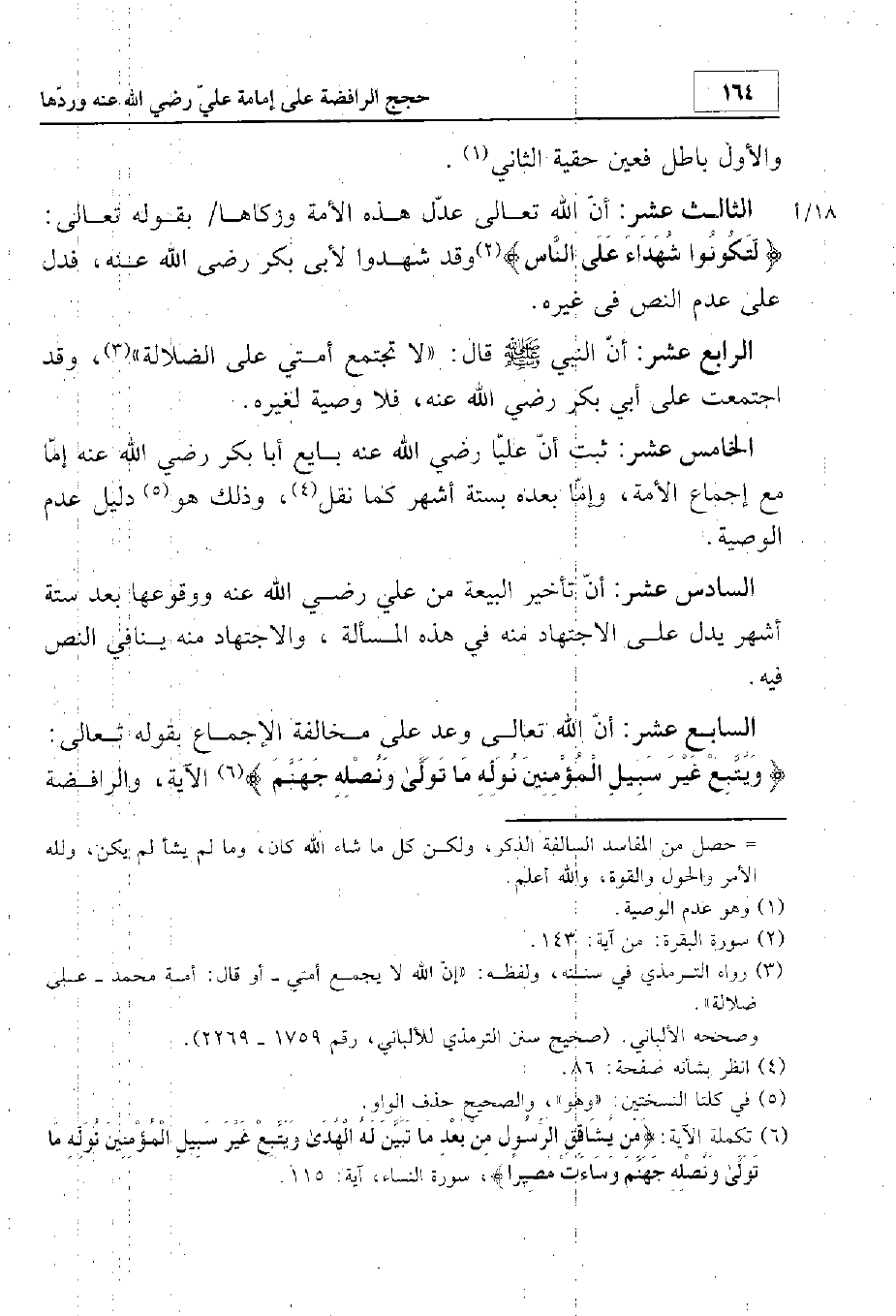 الرابع عشر: أن النبي - صلى الله عليه وسلم - قال: «لا تجتمع أمتي على ضلالة»، وقد اجتمعت على أبي بكر رضي الله عنه. فلا وصية لغيره.