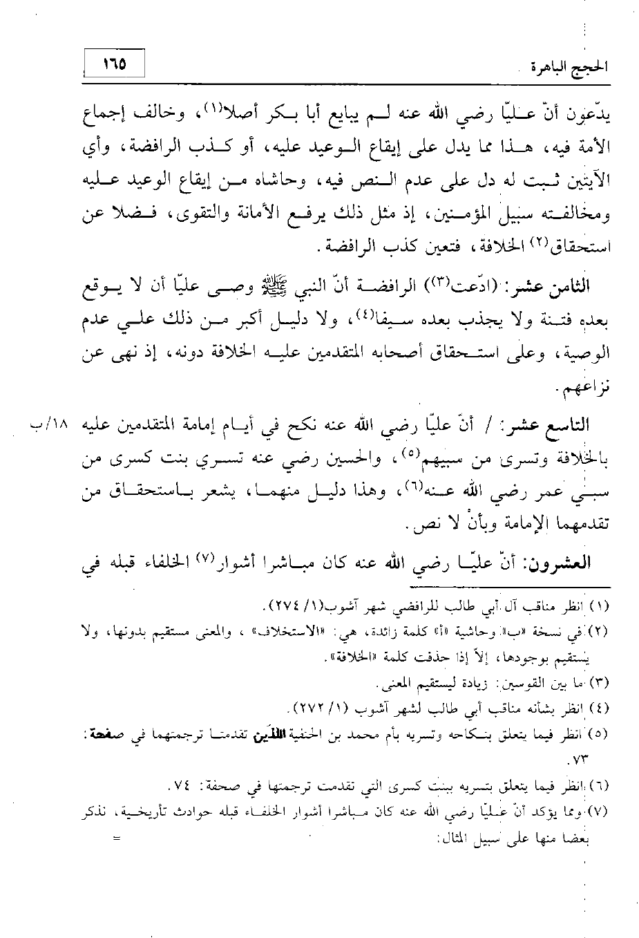 التاسع عشر: أن عليا رضي الله عنه نكح في أيام إمامة المتقدمين عليه بالخلافة وتسرّى من سبيهم. والحسين رضي الله عنه تسرى بنت كسرى من سبي عمر رضي الله عنه. وهذا دليل منهما يشعر باستحقاق من تقدمهما الإمامة وبأن لا نص [لغيرهم].