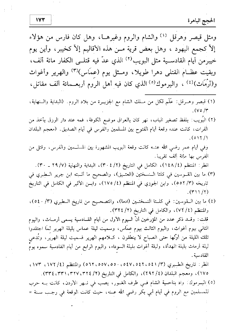 ومثل قيصر وهرقل والشام والروم وغيرها. وهل كان فارس من هؤلاء إلا كجمع اليهود، وهل بعض قرية من هذه الأقاليم إلا كخيبر. وأين يوم خيبر من أيام القادسية مثل البويب الذي عد فيه قتلى الكفار مائة ألف وبقيت عظام القتلى دهرا طويلا، ومثل يوم عماس والهرير وأغواث وأرماث واليرموك الذي كان فيه أهل الروم أربعمائة ألف مقاتل،