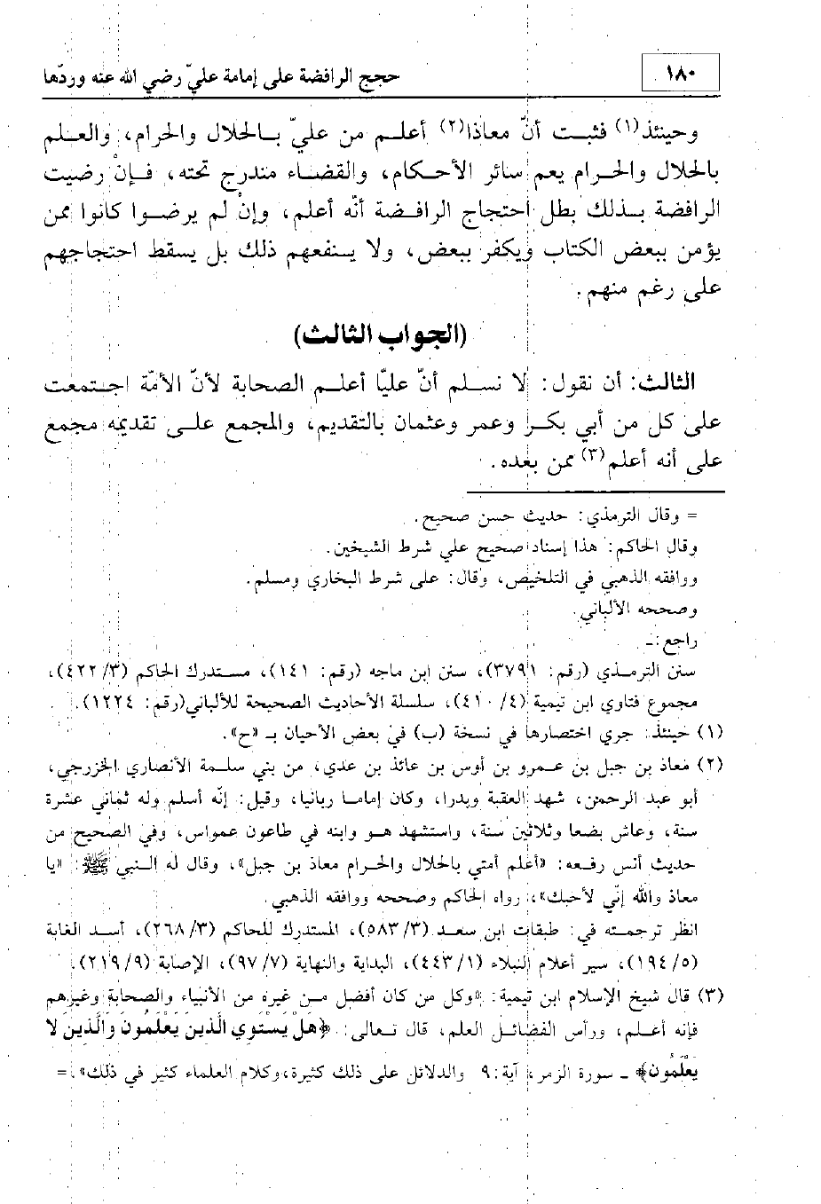 وحينئذ فثبت أن معاذا أعلم من علي بالحلال والحرام. والعلم بالحلال والحرام يعم سائر الأحكام، والقضاء مندرج تحته. فإن رضيت الرافضة بذلك بطل احتجاج الرافضة أنه أعلم. وإن لم يرضوا كانوا ممن يؤمن ببعض الكتاب ويكفر ببعض. ولا ينفعهم ذلك بل يسقط احتجاجهم على رغم منهم.