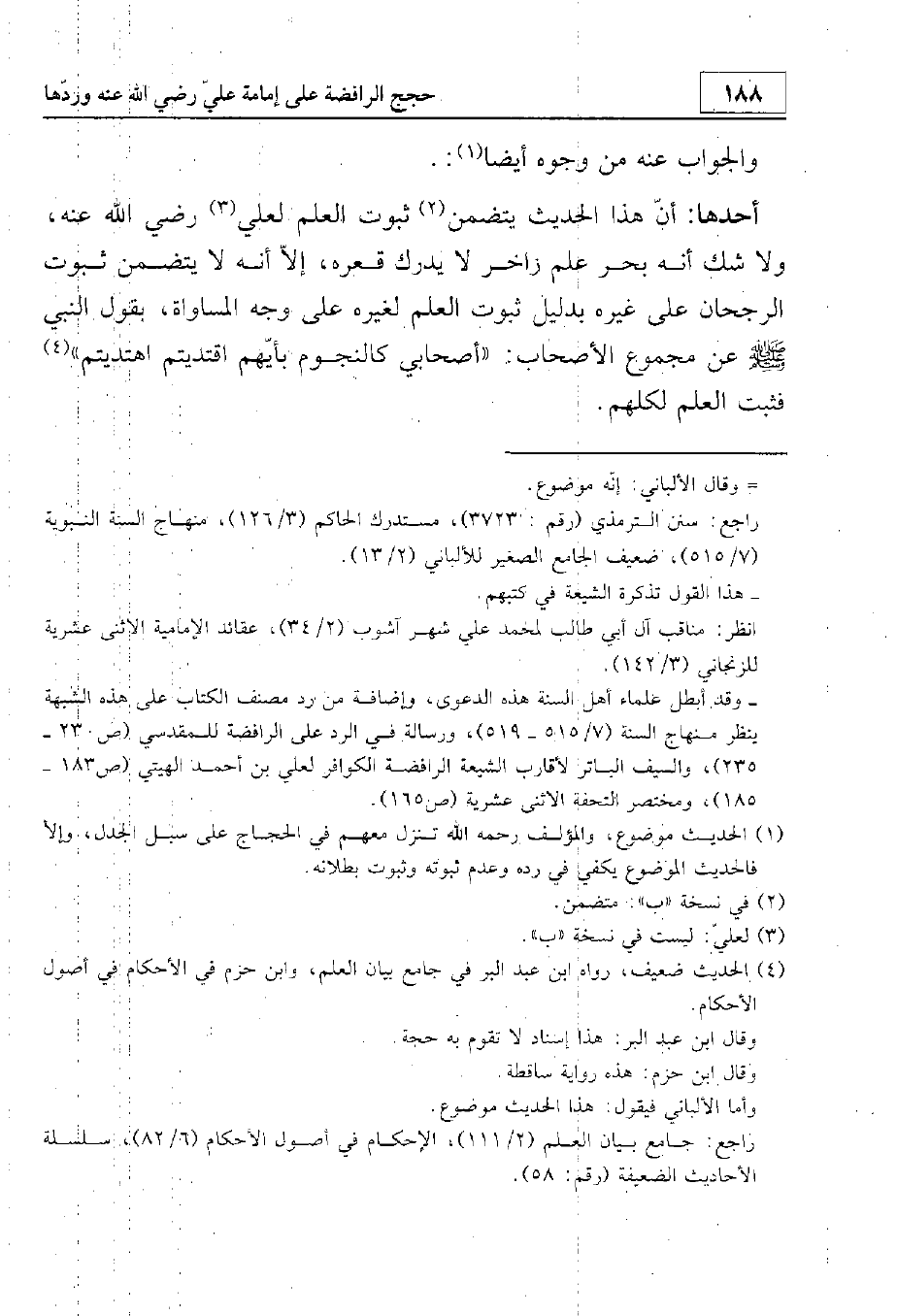 أحدها: أن هذا الحديث يتضمن ثبوت العلم لعلي رضي الله عنه. ولا شك أنه بحر علم زاخر لا يدرك قعره. إلا أنه لا يتضمن ثبوت الرجحان على غيره، بدليل ثبوت العلم لغيره على وجه المساواة بقول النبي - صلى الله عليه وسلم - عن مجموع الأصحاب: "أصحابي كالنجوم بأيهم اقتديتم اهتديتم". فثبت العلم لكلهم.