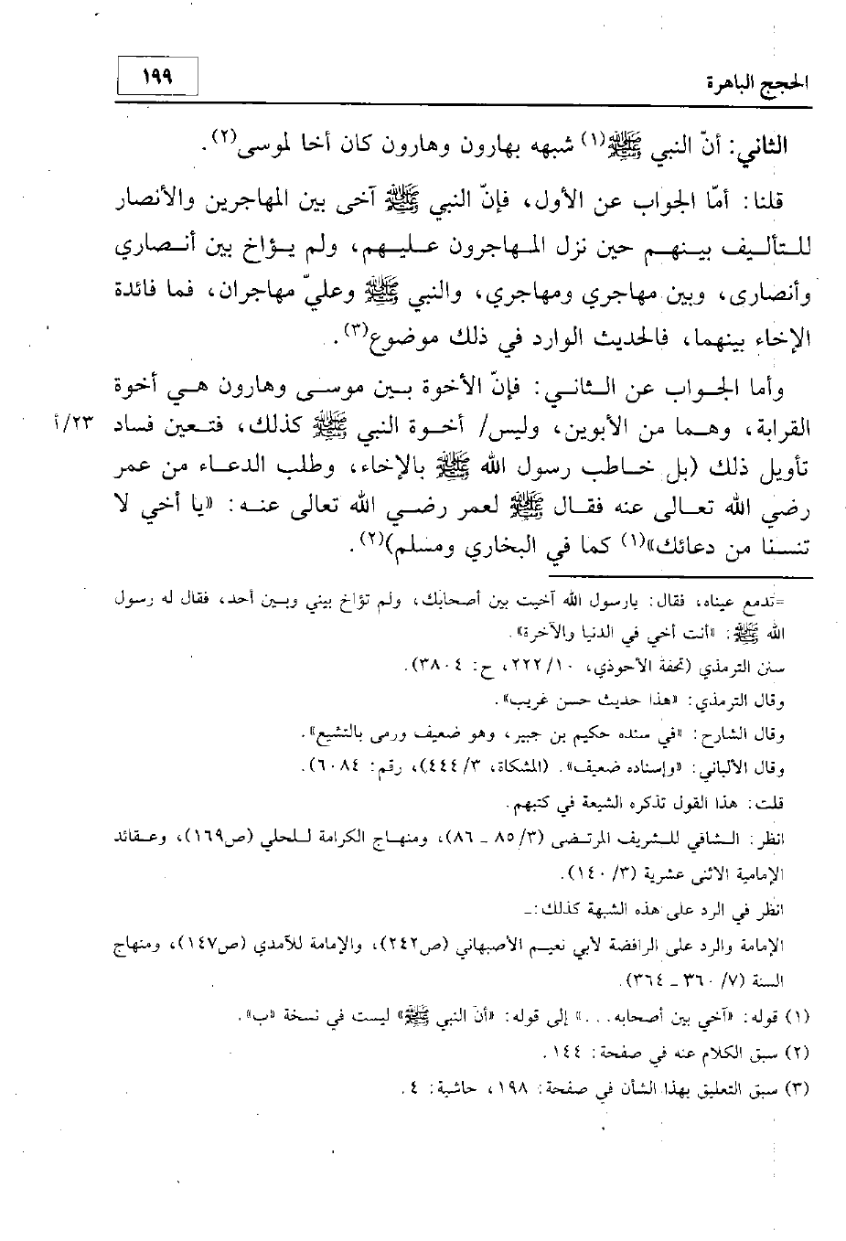 قلنا: أما الجواب عن الأول فإن النبي - صلى الله عليه وسلم - آخى بين المهاجرين والأنصار للتأليف بينهم حين نزل المهاجرون عليهم. ولم يؤاخ بين أنصاري وأنصاري، وبين مهاجري ومهاجري. والنبي - صلى الله عليه وسلم - وعلي مهاجران، فما فائدة الإخاء بينهما. فالحديث الوارد في ذلك موضوع.