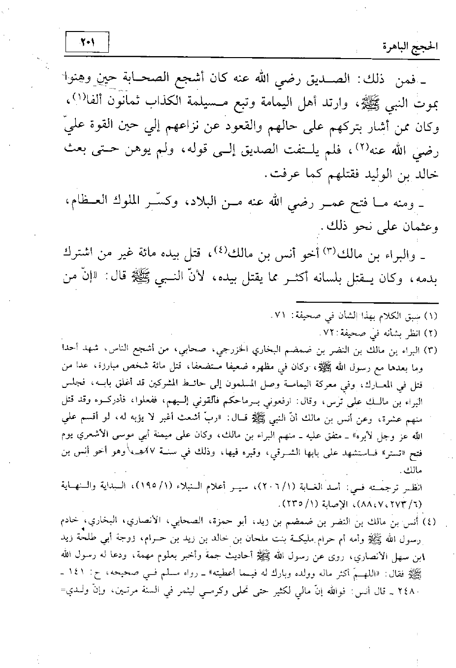 فمن ذلك الصديق رضي الله عنه، كان أشجع الصحابة حين وهنوا بموت النبي - صلى الله عليه وسلم - وارتد أهل اليمامة وتبع مسيلمة الكذاب ثمانون ألفا، وكان ممن أشار بتركهم على حالهم والقعود عن نزاعهم إلى حين القوة علي رضي الله عنه، فلم يلتفت الصديق إلى قوله ولم يوهن حتى بعث خالد بن الوليد فقتلهم كما عرفت. ومنه ما فتح عمر رضي الله عنه من البلاد وكسر الملوك العظام، وعثمان على نحو ذلك. والبراء بن مالك، أخو أنس بن مالك، قتل بيده مائة غير من اشترك بدمه، وكان يقتل بلسانه أكثر مما يقتل بيده، لأن النبي - صلى الله عليه وسلم - قال: «إن من
