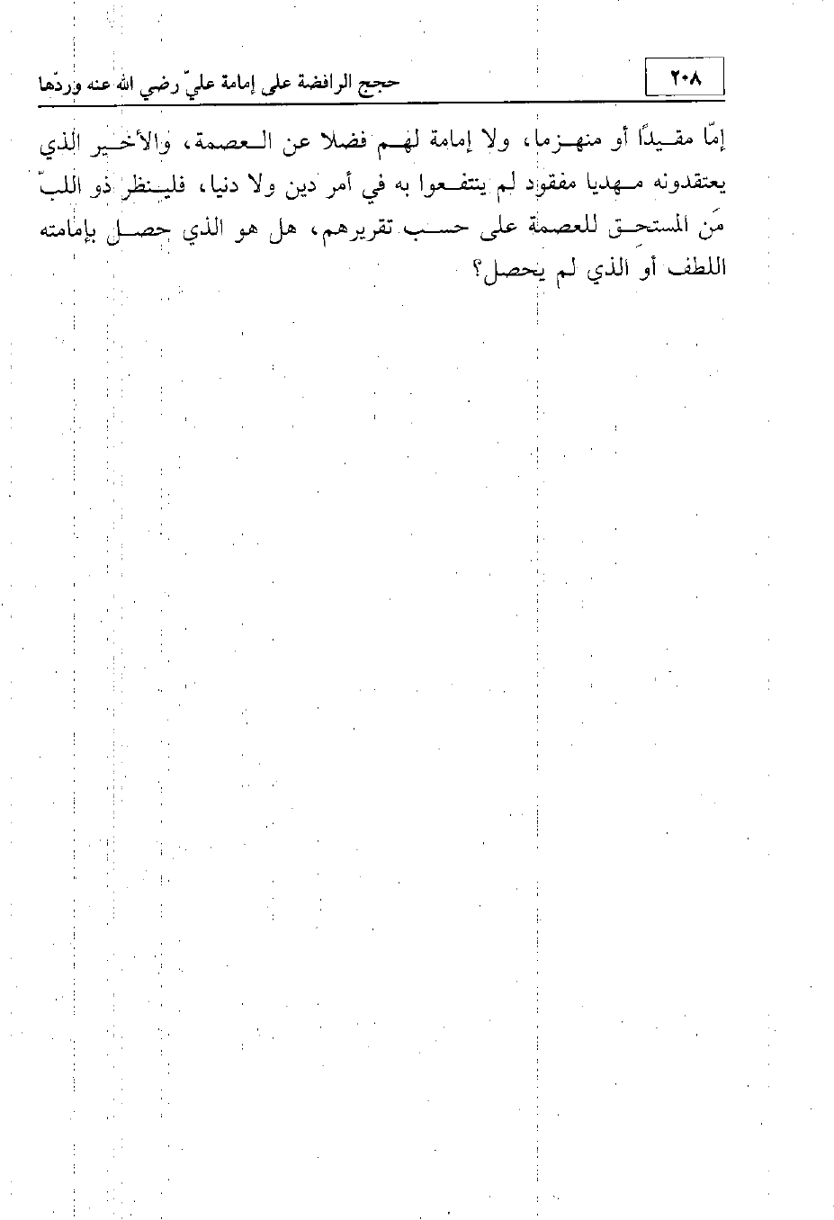 إما مقيد أو منهزم؛ ولا إمامة لهم فضلا عن العصمة. والأخير الذي يعتقدونه مهديا مفقود لم ينتفعوا به في أمر دين ولا دنيا. فلينظر ذو اللب من المستحق للعصمة على حسب تقريرهم: هل هو الذي حصل بإمامته اللطف أو الذي لم يحصل.