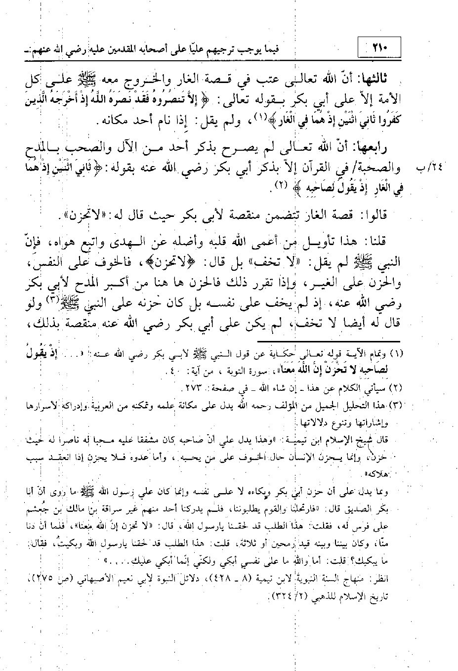 ثالثها: أن الله تعالى عتب في قصة الغار والخروج معه - صلى الله عليه وسلم - على كل الأمة إلا على أبي بكر بقوله تعالى: {إِلَّا تَنْصُرُوهُ فَقَدْ نَصَرَهُ اللَّهُ إِذْ أَخْرَجَهُ الَّذِينَ كَفَرُوا ثَانِيَ اثْنَيْنِ إِذْ هُمَا فِي الْغَارِ} ولم يقل: إذ نام أحد مكانه.