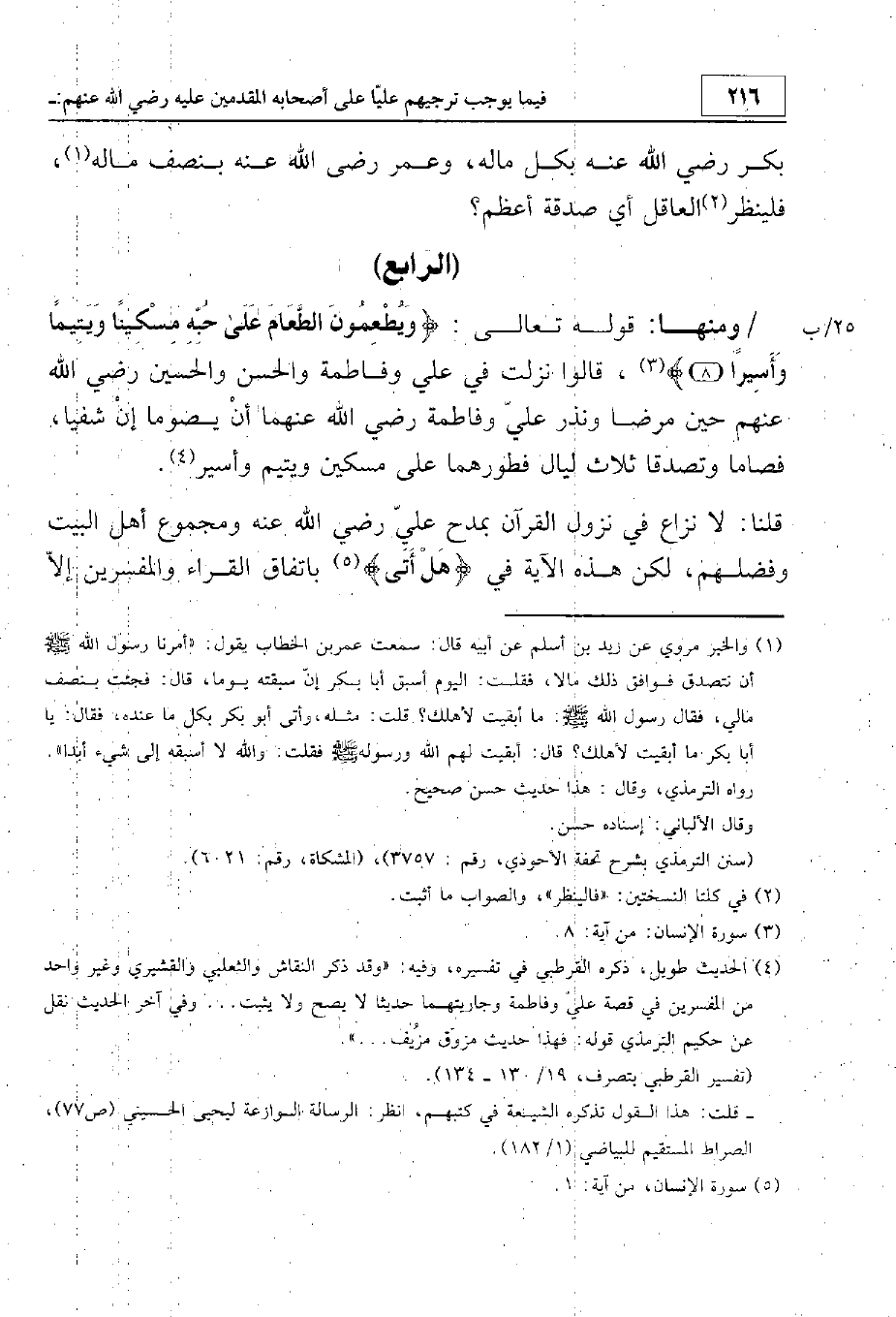 ومنها قوله تعالى {وَيُطْعِمُونَ الطَّعَامَ عَلَى حُبِّهِ}، قالوا نزلت في علي وفاطمة والحسن والحسين رضي الله عنهم حين مرضا ونذر علي وفاطمة رضي الله عنهما أن يصوما إن شفيا. فصاما وتصدقا ثلاث ليال بفطورهما على مسكين ويتيم وأسير.