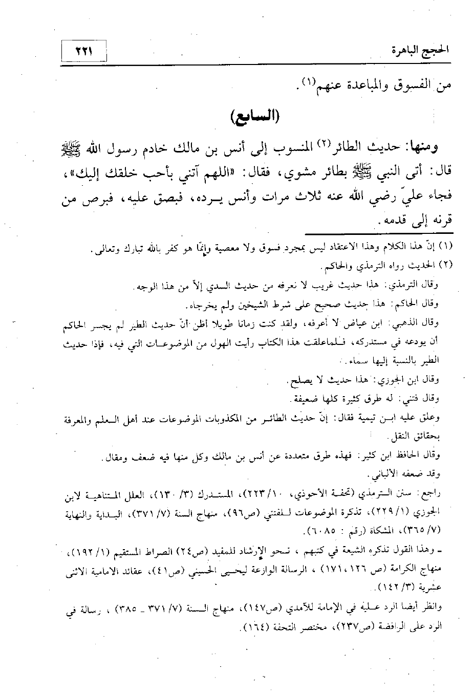 ومنها حديث الطائر المنسوب إلى أنس بن مالك خادم النبي - صلى الله عليه وسلم - قال: أتي النبي - صلى الله عليه وسلم - بطائر مشوي فقال: "اللهم ائتني بأحب خلقك إليك" فجاء علي رضي الله عنه وأنس يرده، فبصق عليه، فبرص من قرنه إلى قدمه.