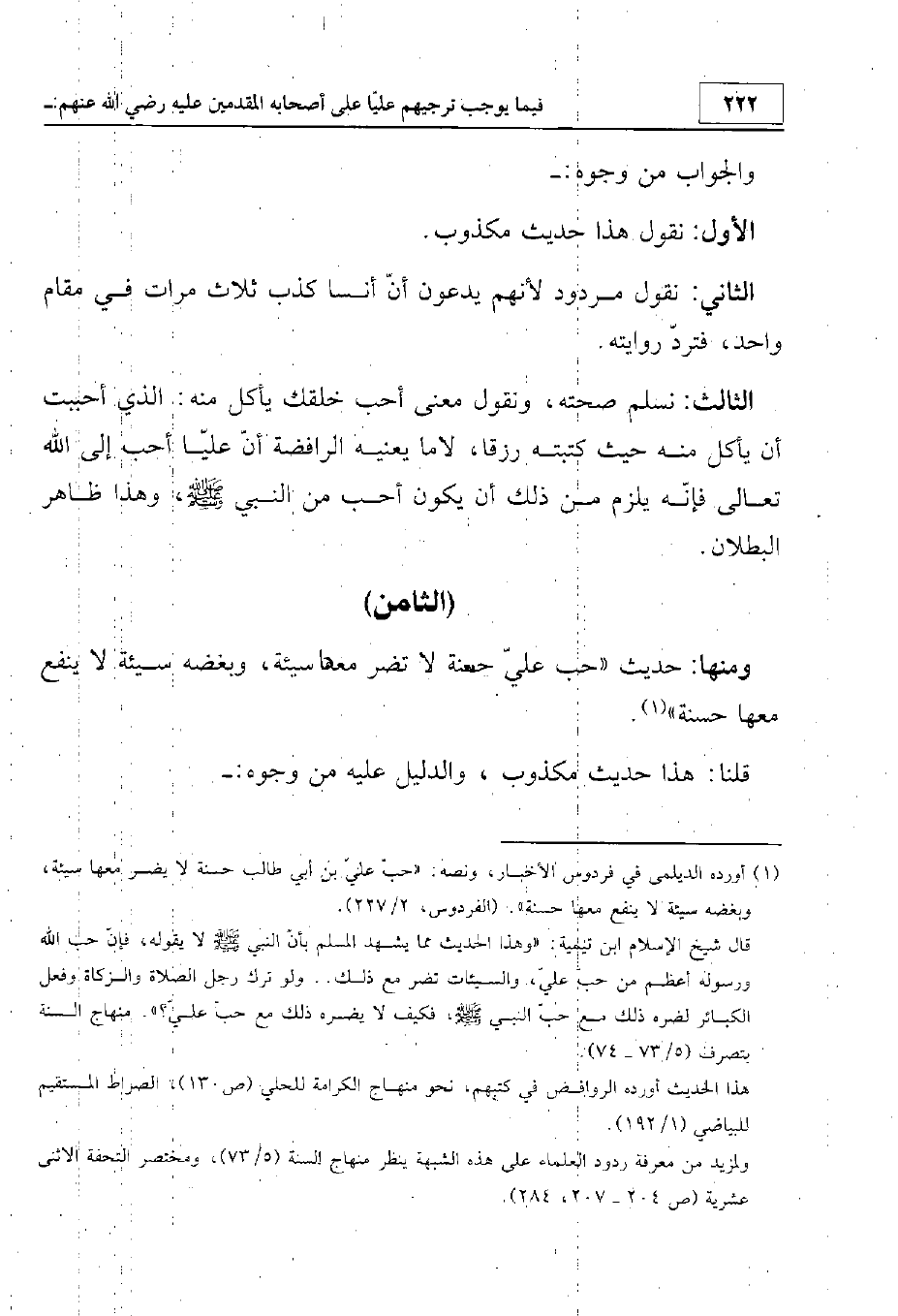 الثالث نسلم صحته ونقول معنى "أحب خلقك يأكل منه": الذي أحببت أن يأكل منه حيث كتبته رزقا. لا ما يعنيه الرافضة أن عليا أحب إلى الله تعالى، فإنه يلزم من ذلك أن يكون أحب من النبي - صلى الله عليه وسلم -، وهذا ظاهر البطلان.