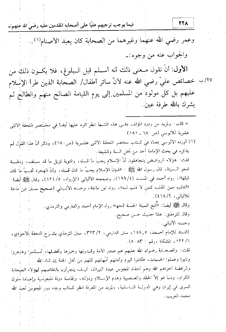 الأول أن نقول معنى ذلك أنه أسلم قبل البلوغ. فلا يكون ذلك من خصائص علي رضي الله عنه. لأن سائر أطفال الصحابة الذين طرأ الإسلام عليهم، بل كل مولود من المسلمين إلى يوم القيامة الصالح منهم والطالح لم يشرك بالله طرفة عين.