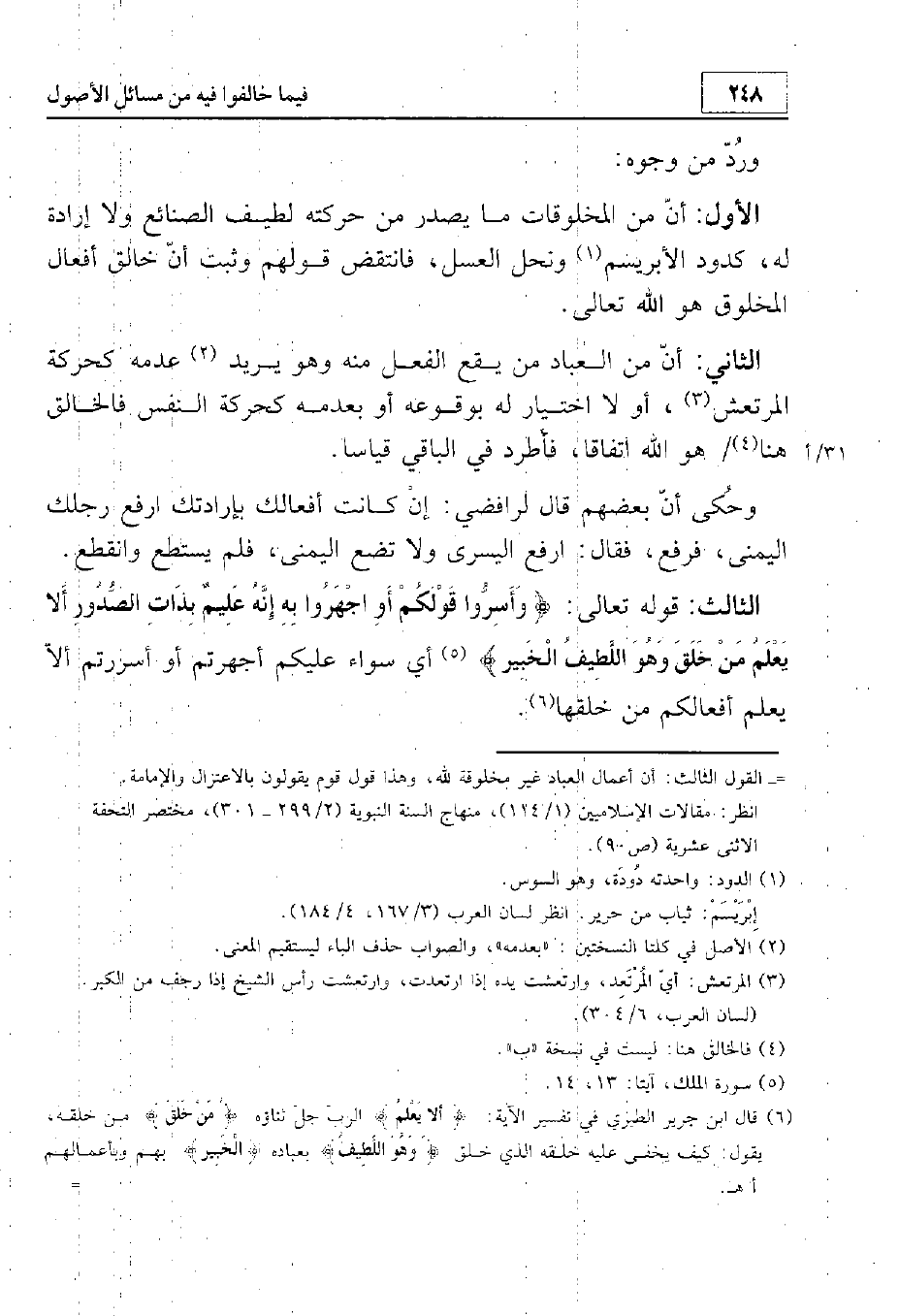الأول: أن من المخلوقات ما يصدر من حركته لطيف الصنائع ولا إرادة له، كدود الإبريسم ونحل العسل، فانتقض قولهم وثبت أن خالق أفعال المخلوق هو الله تعالى.
