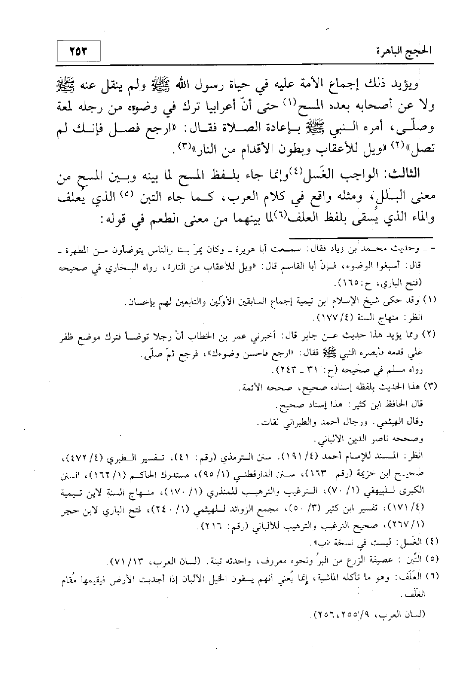 ويؤيد ذلك إجماع الأمة عليه في حياة رسول الله - صلى الله عليه وسلم -. ولم ينقل عنه - صلى الله عليه وسلم - ولا عن أصحابه بعده المسح. حتى أن أعرابيا ترك في وضوءه من رجله لمعة أمره النبي - صلى الله عليه وسلم - بإعادة الصلاة فقال: «ارجع فصل فإنك لم تصل» «ويل للأعقاب وبطون الأقدام من النار».