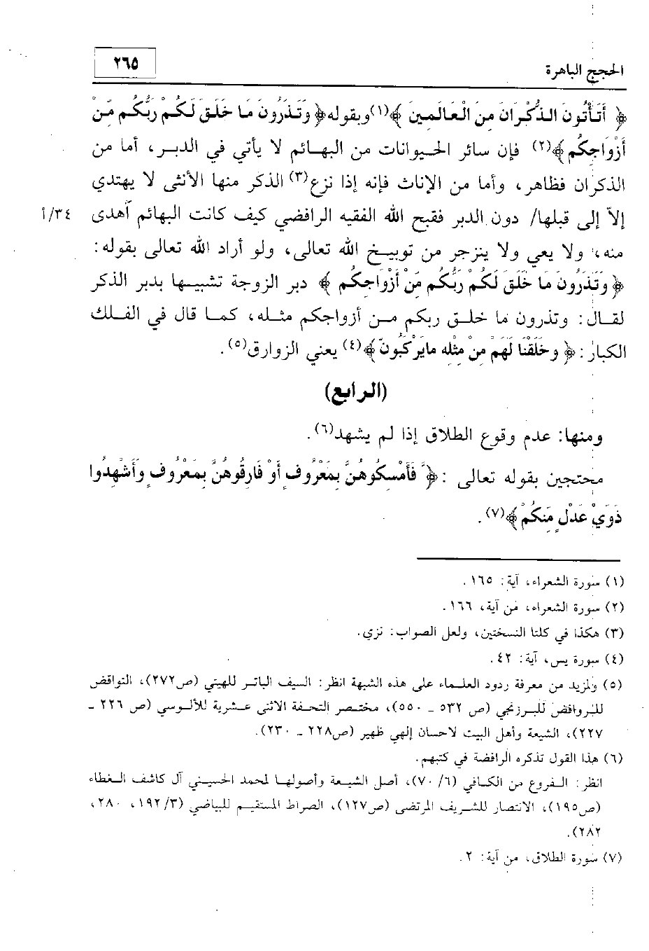 {أَتَأْتُونَ الذُّكْرَانَ مِنَ الْعَالَمِينَ} وبقوله: {وَتَذَرُونَ مَا خَلَقَ لَكُمْ رَبُّكُمْ مِنْ أَزْوَاجِكُمْ} فإن سائر الحيوانات من البهائم لا يأتي في الدبر. أما من الذكران فظاهر. وأما من الإناث فإنه إذا نزع الذكر منها الأنثى لا يهتدي إلا إلى قبلها دون الدبر. فقبح الله الفقيه الرافضي كيف كانت البهائم أهدى منه، ولا يعي ولا ينزجر من توبيخ الله تعالى. ولو أراد الله تعالى بقوله: {وَتَذَرُونَ مَا خَلَقَ لَكُمْ رَبُّكُمْ مِنْ أَزْوَاجِكُمْ} دبر الزوجة تشبيها بدبر الذكر لقال: وتذرون ما خلق ربكم من أزوجكم مثله، كما قال في الفلك الكبار: {وَخَلَقْنَا لَهُمْ مِنْ مِثْلِهِ مَا يَرْكَبُونَ} يعني الزوارق.