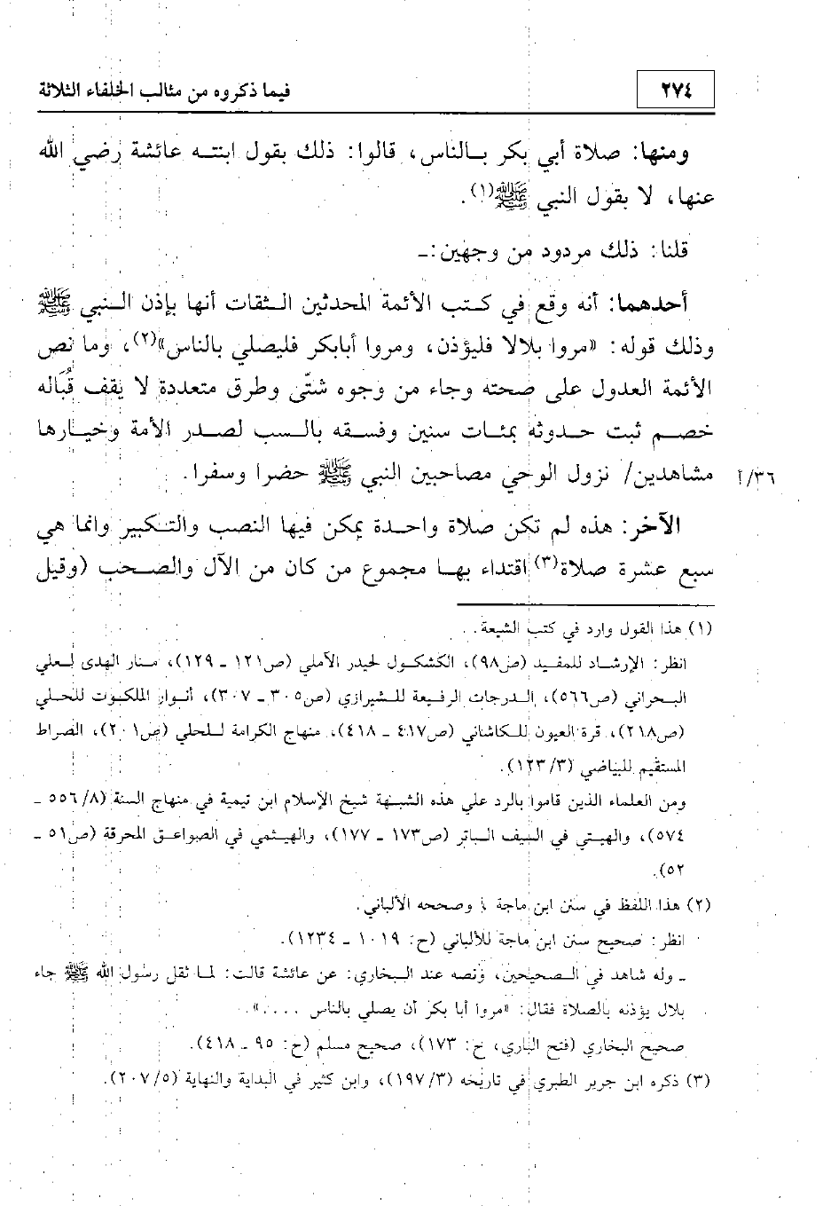 أحدهما أنه وقع في كتب الأئمة المحدثين الثقات أنها بإذن النبي - صلى الله عليه وسلم - وذلك قوله: «مروا بلالا فليؤذن ومروا أبا بكر فليصلي بالناس»، وما نص الأئمة العدول على صحته وجاء من وجوه شتى وطرق متعددة لا يقف قباله خصم ثبت حدوثه بمئات سنين وفسقه بالسب لصدر الأمة وخيارها مشاهدين نوزل الوحي مصاحبين النبي - صلى الله عليه وسلم - حضرا وسفرا.