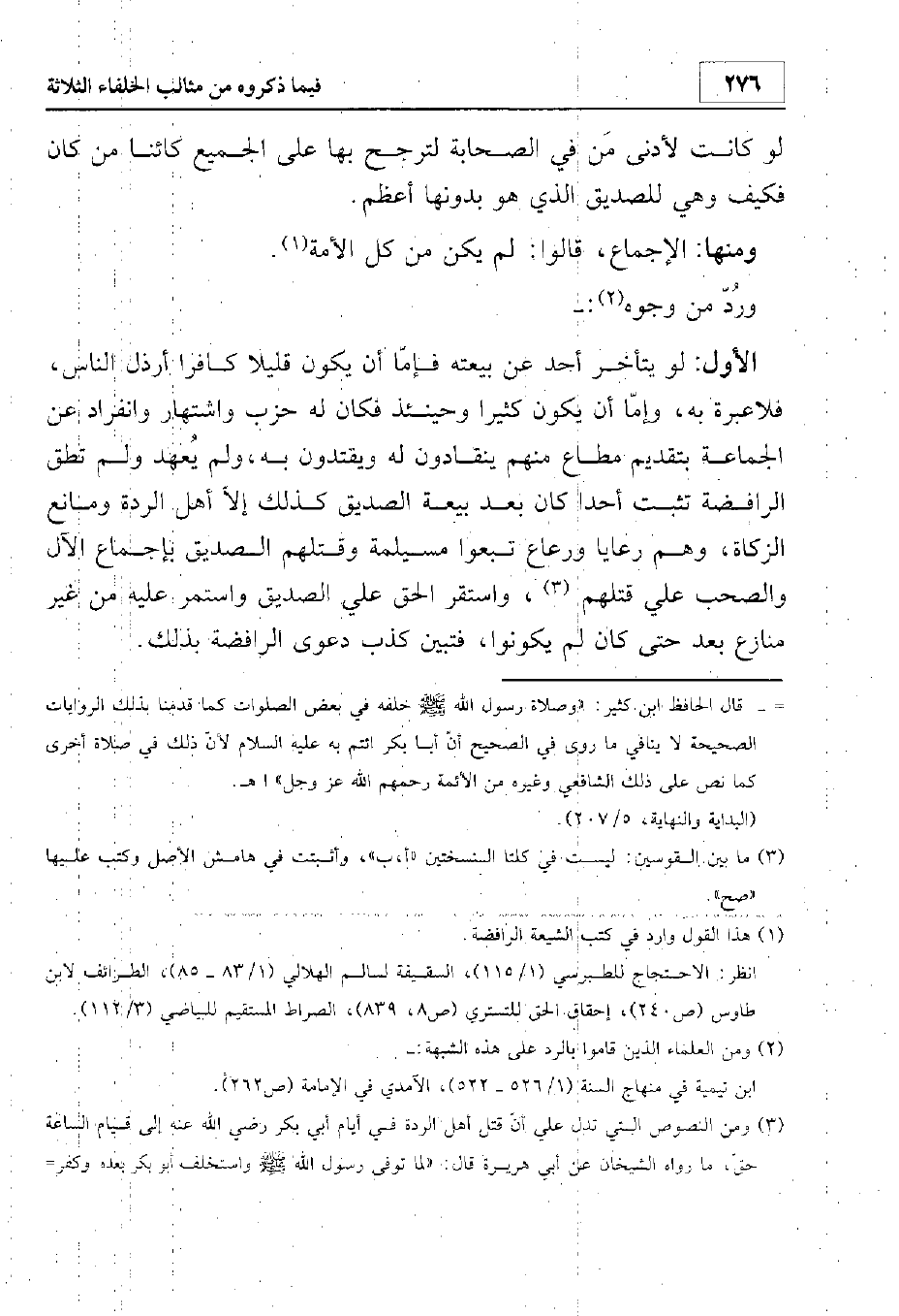 الأول: لو يتأخر أحد عن بيعته فإما أن يكون قليلا كافرا أرذل الناس، فلا عبرة به، وإما أن يكون كثيرا، وحينئذ فكان له حزب واشتهار وانفراد عن الجماعة بتقديم مطاع منهم ينقادون له ويقتدون به. ولم يُعهد ولم تطق الرافضة تثبت أحدا كان بعد بيعة الصديق كذلك إلا أهل الردة ومانع الزكاة، وهم رعايا ورعاع تبعوا مسيلمة وقتلهم الصديق بإجماع الآل والصحب على قتلهم. واستقر الحق على الصديق واستمر عليه من غير منازع بعد حتى كأن لم يكونوا. فتبين كذب الرافضة.