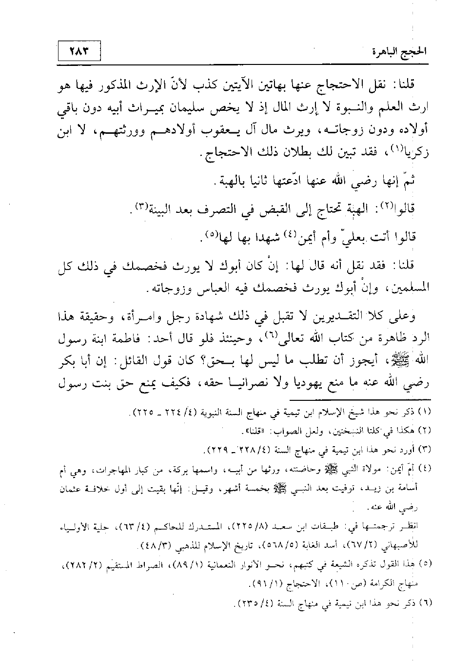 قلنا: نقل الاحتجاج عنها بهاتين الآيتين كذب لأن الإرث المذكور فيها هو إرث العلم والنبوة، لا إرث المال؛ إذ لا يخص سليمان بميراث أبيه دون باقي أولاده ودون زوجاته، ويرث مال آل يعقوب أولادهم وورثتهم لا ابن زكريا. فقد تبين لك بطلان ذلك الاحتجاج.