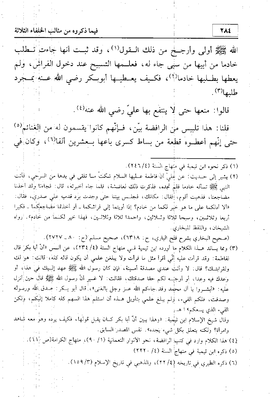 الله - صلى الله عليه وسلم - " أولى وأرجح من ذلك القول. وقد ثبت أنها جاءت تطلب خادما من أبيها من سبي جاء له، فعلمها التسبيح عند دخول الفراش ولم يعطها بطلبها خادما. فكيف يعطيها أبو بكر رضي الله عنه بمجرد طلبها.