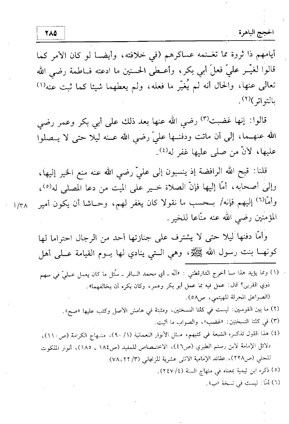 قلنا: قبح الله الرافضة إذ ينسبون إلى علي رضي الله عنه منع الخير إليها وإلى أصحابه. أما إليها فإن الصلاة خير على الميت من دعاء المصلي له. وأما إليهم فإنه بحسب ما نقلوه كان يغفر لهم. وحاشا أن يكون أمير المؤمنين رضي الله عنه مناعا للخير. وأما دفنها ليلا: حتى لا يشرف على جنازتها أحد من الرجال احتراما لها كونها بنت رسول الله - صلى الله عليه وسلم -، وهي ينادي لها في القيامة على أهل