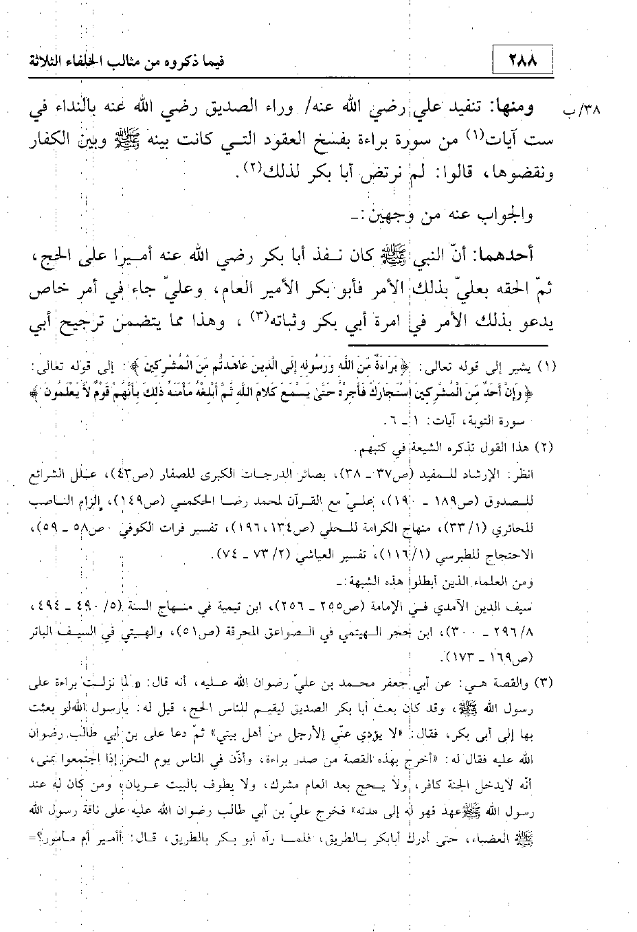 أحدهما أن النبي - صلى الله عليه وسلم - كان نفذ أبا بكر أميرا على الحج، ثم ألحقه بعلي بذلك الأمر؛ فأبو بكر الأمير العام، وعلي رضي الله عنه جاء في أمر خاص يدعو بذلك الأمر في إمرة أبي بكر ونيابته. وهذا مما يتضمن ترجيح أبي