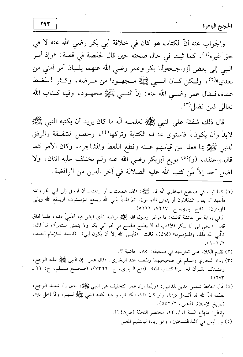 والجواب عنه أن الكتاب هو كان في خلافة أبي بكر رضي الله عنه لا في حق غيره، كما ثبت في حال صحته حين قال لحفصة في قصة {وَإِذْ أَسَرَّ النَّبِيُّ إِلَى بَعْضِ أَزْوَاجِهِ حَدِيثًا} وأبا بكر وعمر رضي الله عنهما يليان أمر أمتي من بعدي. ولكن كان النبي - صلى الله عليه وسلم - مجهودا من مرضه وكثر اللغظ عنده فقال عمر رضي الله عنه: إن النبي - صلى الله عليه وسلم - مجهود، وفينا كتاب الله تعالى فلن نضل. قال ذلك شفقة على النبي - صلى الله عليه وسلم - لعلمه أنه ما كان يريد أن يكتبه النبي - صلى الله عليه وسلم - لا بد وأن يكون، فاستوى عنده الكتابة وتركها، وحصل الشفقة والرفق للنبي - صلى الله عليه وسلم - بما فعله من قيامهم عنه وقطع اللغط والمشاجرة، وكان الأمر كا قال واعتقد: بويع أبو بكر رضي الله عنه ولم يختلف عليه اثنان. ولا أضل أحد إلا من كتب الله عليه الضلالة في آخر الدين من الرافضة.