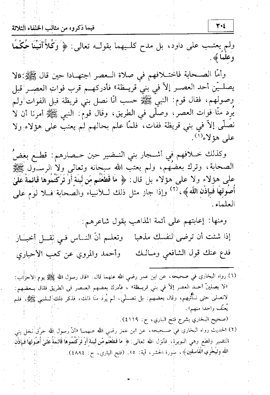 وأما الصحابة فاختلافهم في صلاة العصر اجتهادا حين قال - صلى الله عليه وسلم -: «لا يصلين أحد العصر إلا في بني قريظة» فأدركهم قرب فوات العصر قبل وصولهم، فقال قوم النبي - صلى الله عليه وسلم - حسب أنا نصل بني قريظة قبل الفوات ولم يرد منا فوات العصر وصلى في الطريق، وقال قوم النبي - صلى الله عليه وسلم - أمرنا أن لا نصلي إلا في بني قريظة ففوت. فلما علم بحالهم لم يعتب على هؤلاء ولا على هؤلاء. وكذلك خلافهم في أشجار بني النضير حين حصارهم: قطع بعض الصحابة وترك بعضهم، ولم يعتب الله سبحانه وتعالى ولا الرسول على هؤلاء ولا على هؤلاء. بل قال: {مَا قَطَعْتُمْ مِنْ لِينَةٍ أَوْ تَرَكْتُمُوهَا قَائِمَةً عَلَى أُصُولِهَا فَبِإِذْنِ اللَّهِ} وإذا جاز مثل ذلك للأنبياء والصحابة فلا لوم على العلماء.
