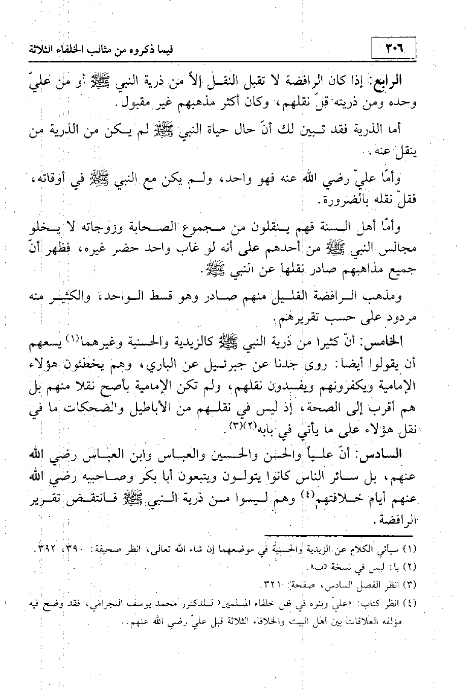 الرابع إذا كان الرافضة لا تقبل النقل إلا من ذرية النبي - صلى الله عليه وسلم - أو من علي وحده ومن ذريته قل نقلهم وكان أكثر مذهبهم غير مقبول. أما الذرية فقد تبين لك أن حال حياة النبي - صلى الله عليه وسلم - لم يكن من الذرية من ينقل عنه. وأما علي رضي الله عنه فهو واحد، ولم يكن مع النبي - صلى الله عليه وسلم - في أوقاته، فقل نقله بالضرورة. وأما أهل السنة فهم ينقلون من مجموع الصحابة وزوجاته، لا يخلو مجالس النبي - صلى الله عليه وسلم - من أحدهم على أنه لو غاب واحد حضر غيره. فظهر أن جميع مذاهبهم صادر نقلها عن النبي - صلى الله عليه وسلم -، ومذهب الرافضة القليل منهم صادر وهو قسط الواحد، والكثير منه مردود على حسب تقريرهم.